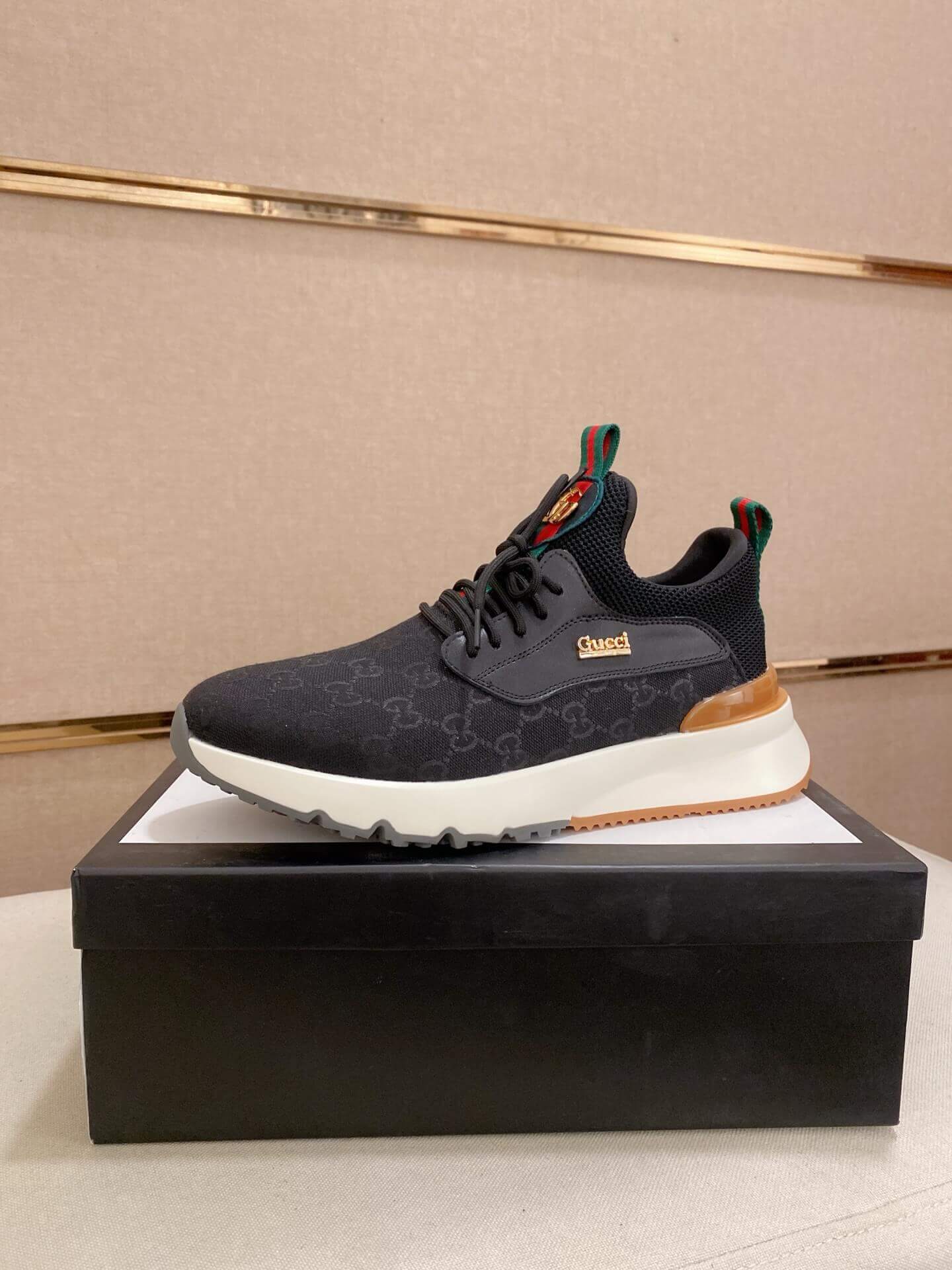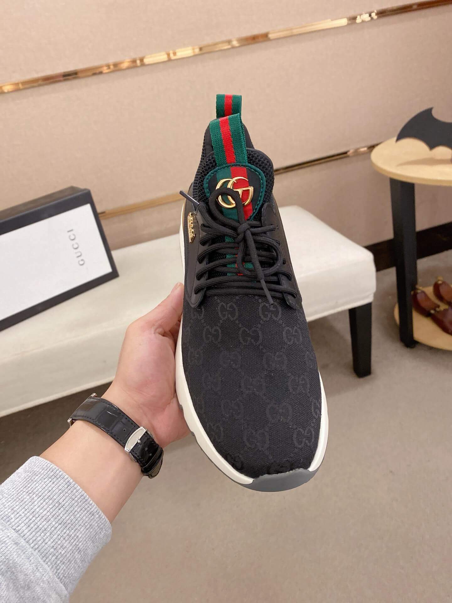 These Gucci sneakers offer a stylish fusion of heritage and contemporary design. The sleek black canvas upper is adorned with the iconic GG Supreme monogram pattern, creating a recognizable and sophisticated texture. A vibrant red and green Web stripe runs down the tongue and features a prominent gold-toned Double G hardware detail, instantly elevating the design with classic Gucci flair. Grounded by a clean white sole, these lace-up trainers provide a comfortable yet luxurious option for the discerning individual who appreciates subtle branding and timeless style.