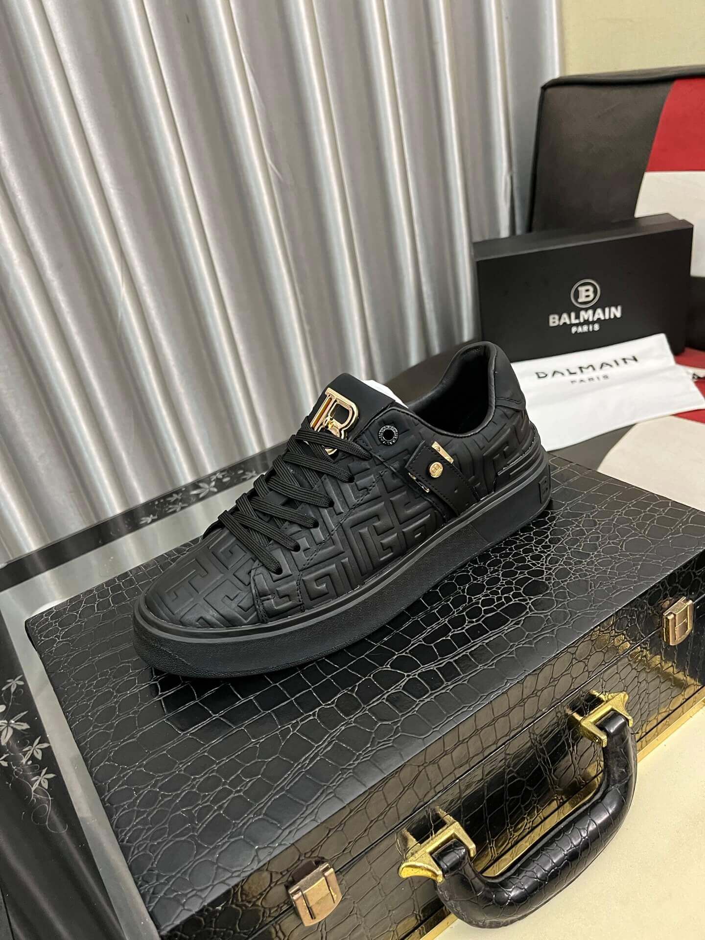 - Embossed Monogram Detailing: The all-black leather upper is exquisitely embossed with Balmain’s iconic monogram pattern, creating a rich texture and an instantly recognizable designer appeal.
