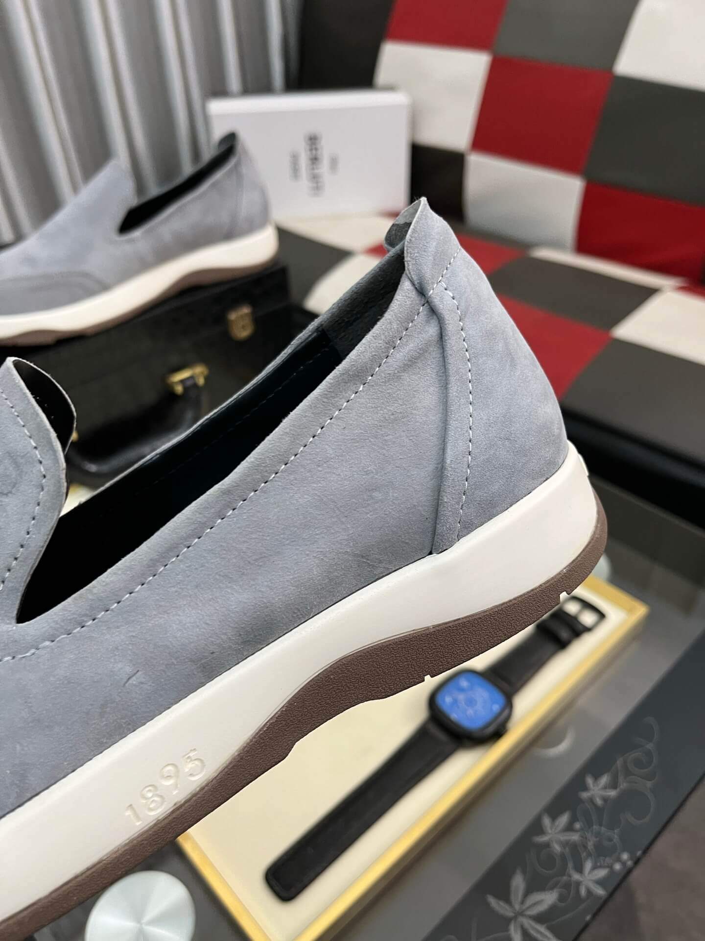 Step into a world of exquisite craftsmanship with these Berluti Echappée loafers, embodying understated luxury and casual elegance. Crafted from sumptuously soft grey suede, these slip-on shoes offer a tactile appeal that is both inviting and refined. The minimalist design is subtly enhanced by the signature Berluti debossed logo on the vamp, a testament to the brand’s meticulous attention to detail. Finished with a contrasting white and brown sole, these loafers promise exceptional comfort for your daily pursuits, whether in the bustling streets or for a relaxed, stylish gathering.