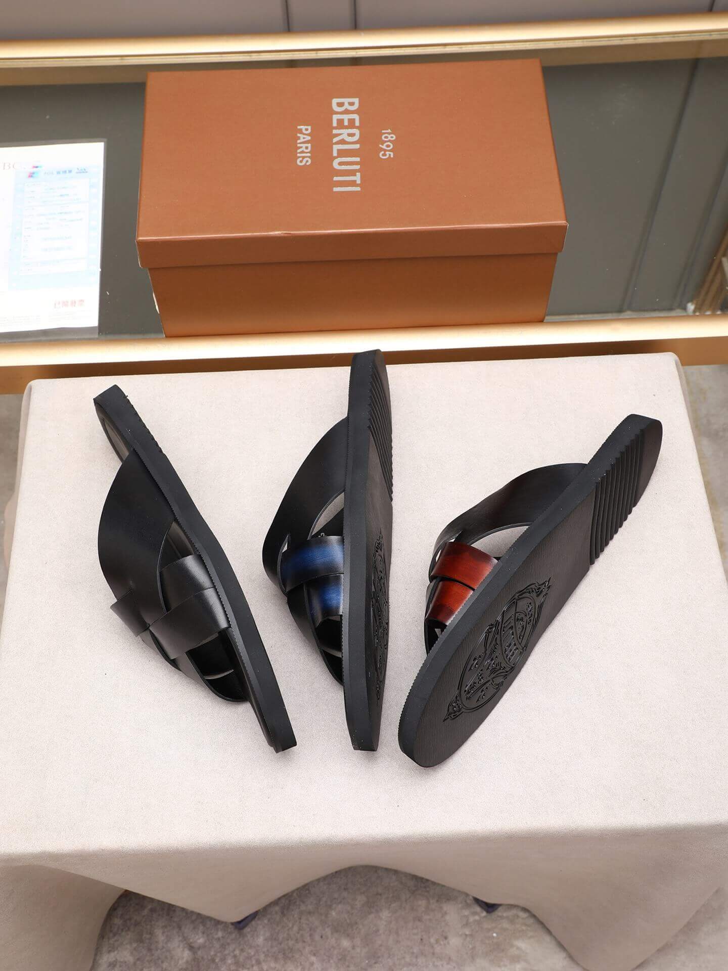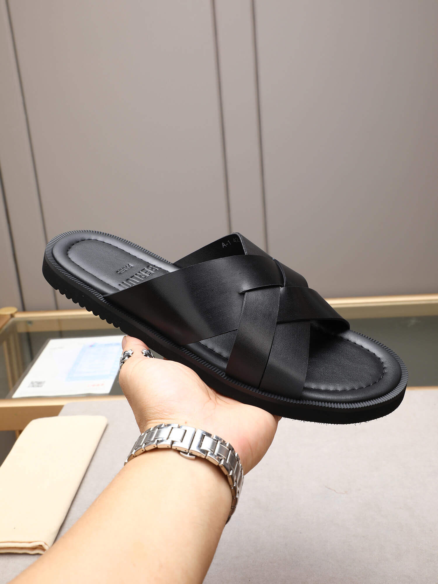 Material: Crafted from high-quality black leather, these sandals feature a subtle “Scritto” effect across the wide crossover straps, adding a touch of unique texture and artistry.