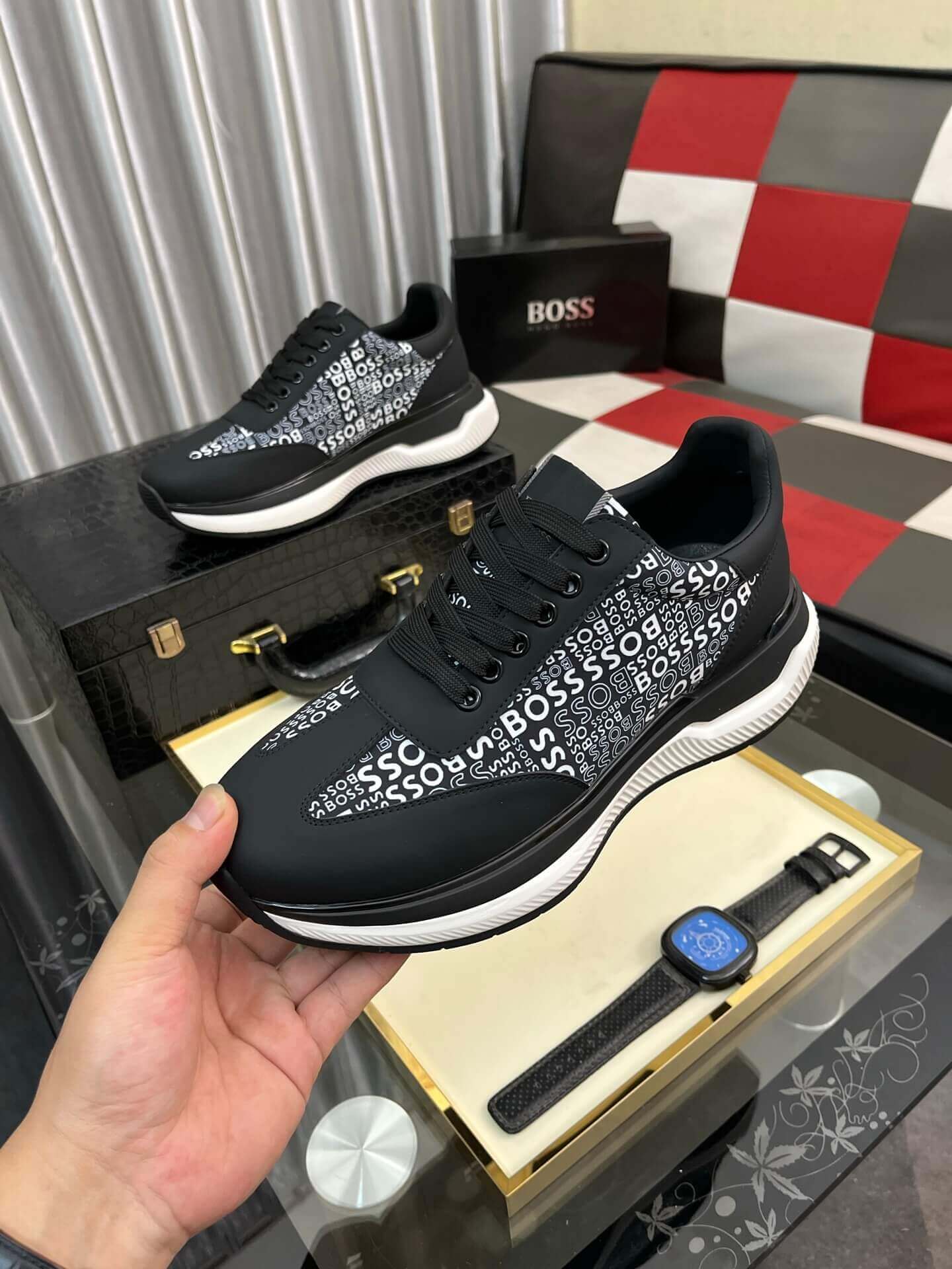 Crafted in striking black mixed-materials, these Boss trainers are a testament to contemporary design that refuses to be ignored. The dynamic repetition of the brand logo across the side adds a captivating visual texture and a touch of urban chic, while the contrasting white sole provides a crisp, modern foundation and comfortable support. Feel the secure embrace of the lace-up closure, the perfect harmony of fashion-forward design and empowering wearability, ensuring you’re always a step ahead.