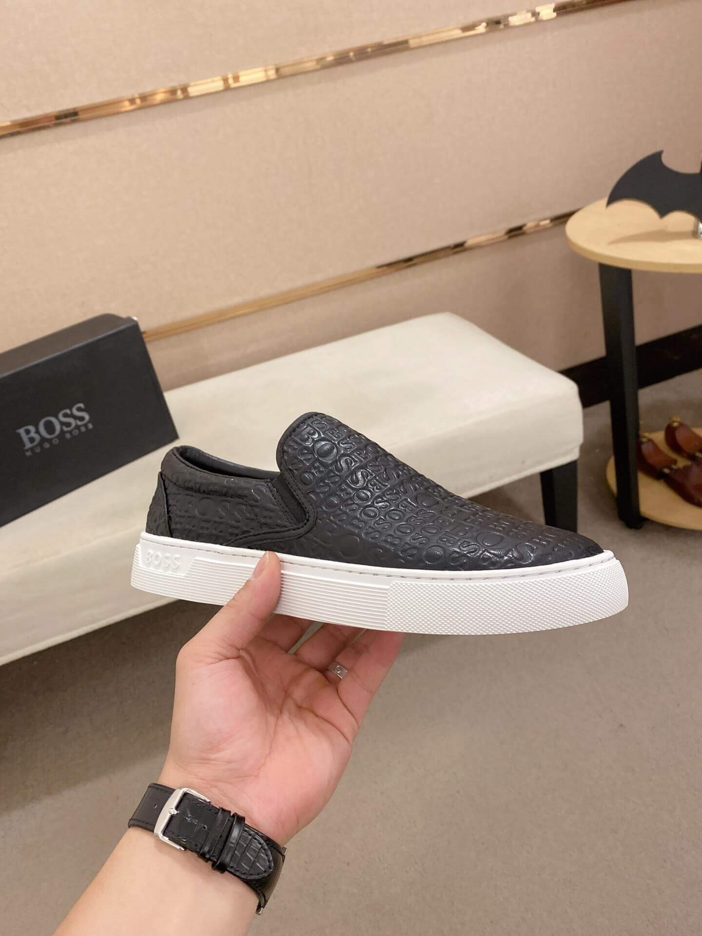 Understated Luxury and effortless style is these elegant BOSS slip-on shoes. Crafted from luxurious black leather, the upper features a distinctive all-over debossed BOSS logo pattern, adding a subtle yet refined texture. The minimalist design is complemented by a crisp white rubber sole, providing both contemporary appeal and comfortable wear. Perfect for those who appreciate understated luxury and seamless style, these slip-ons are an essential addition to any discerning wardrobe.