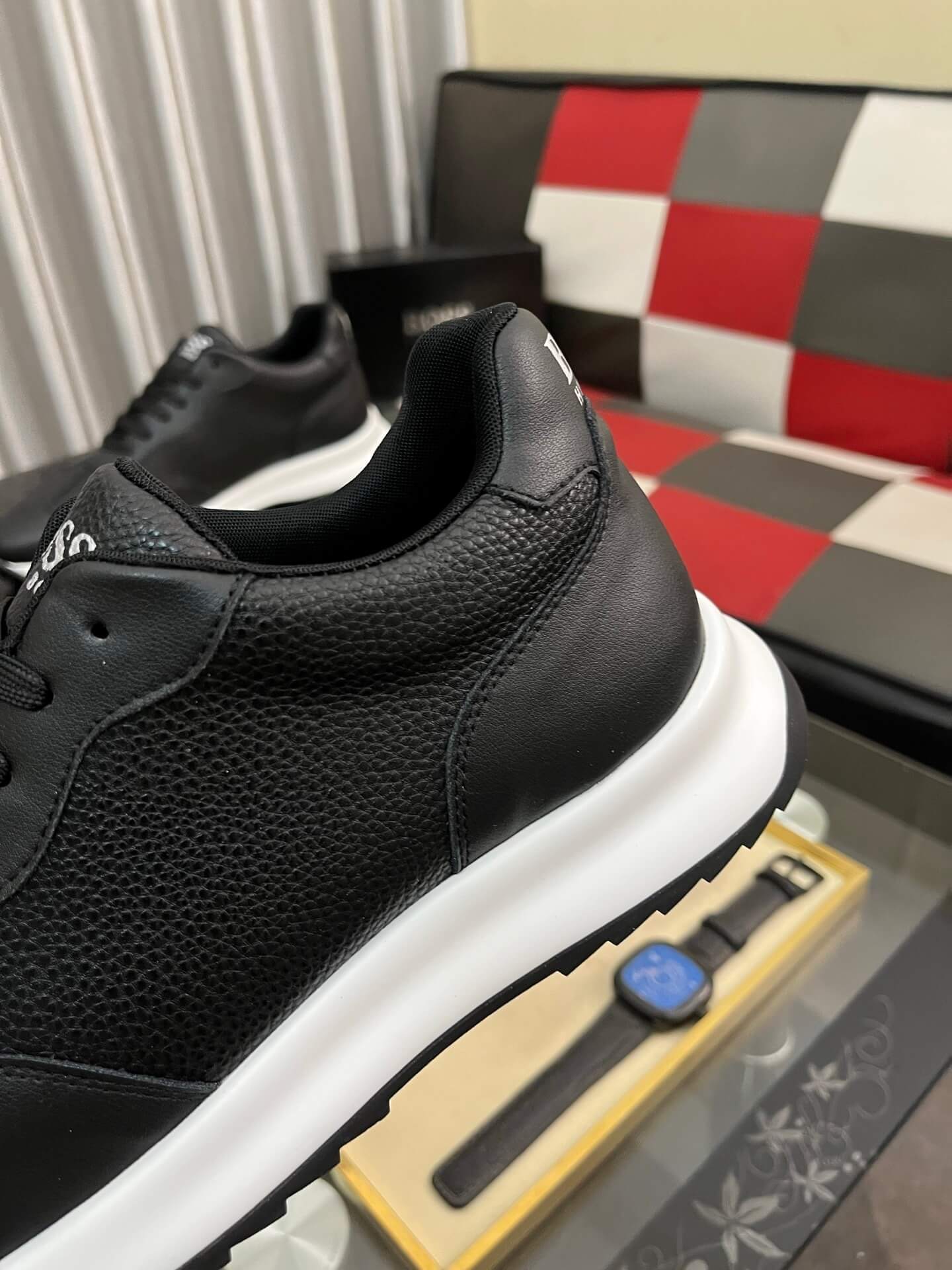 Define your style with the sleek, high-contrast BOSS Black Leather & White Sole Urban Trainer. This sneaker perfectly captures the brand’s sophisticated approach to casual wear, blending premium materials with a clean, dynamic silhouette. The upper is crafted from smooth, high-quality black leather with tonal paneling that ensures a refined look. This monochromatic black upper is powerfully grounded by a crisp, voluminous white rubber running sole, creating a striking contrast that is both modern and effortlessly versatile.