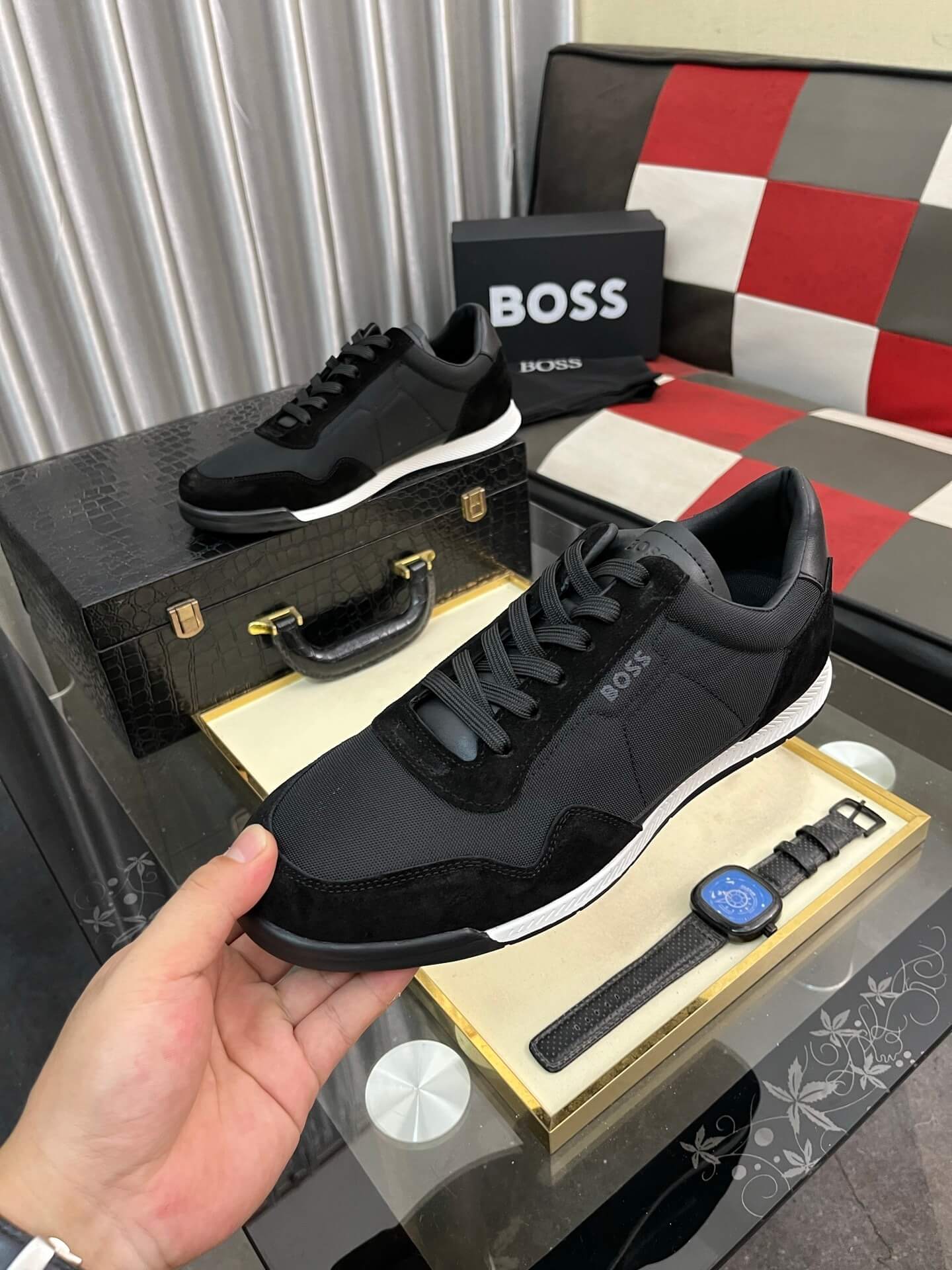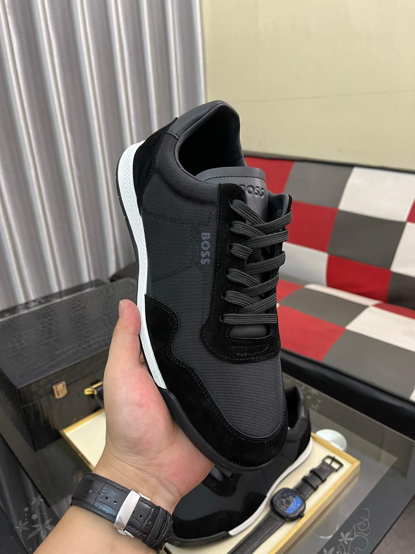 The BOSS is the pinnacle of modern athleisure, blending the relaxed comfort of a trainer with BOSS’s signature sophisticated edge. Crafted from a dynamic two-tone blend of rich black suede and durable leather/textile panels, this shoe offers a sharp, contemporary look that is essential for the discerning, modern man.