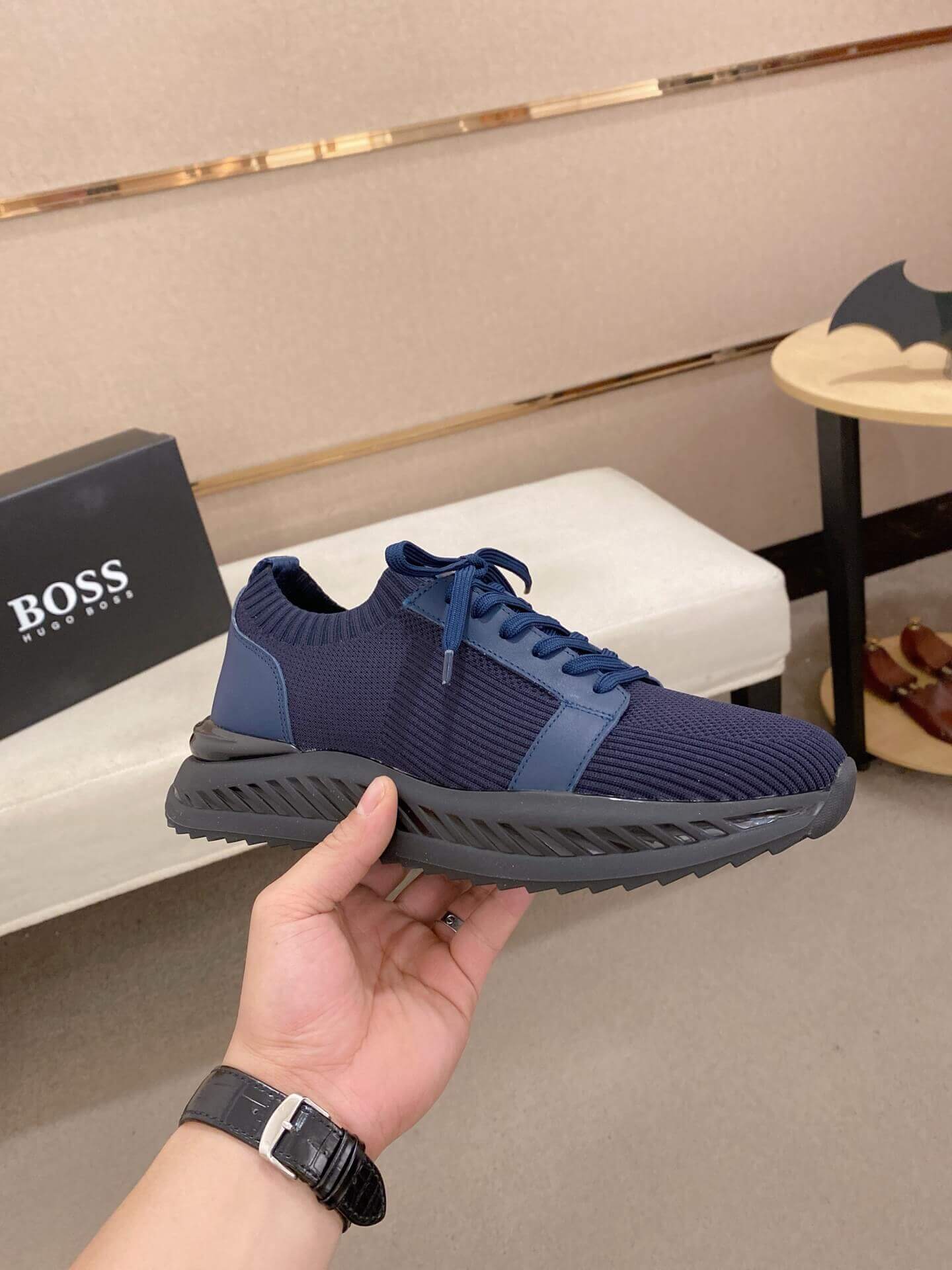 Experience a blend of contemporary style and athletic comfort with the BOSS TTNM Evo trainers in a sophisticated navy blue. The upper is crafted from a flexible, finely knitted fabric, offering a breathable and adaptive fit. Sleek dark blue leather overlays provide structured support and enhance the trainer’s modern lines. The robust sole features a striking, sculpted design with an elevated heel and a textured pattern, delivering both a distinctive aesthetic and cushioned responsiveness for versatile everyday wear.