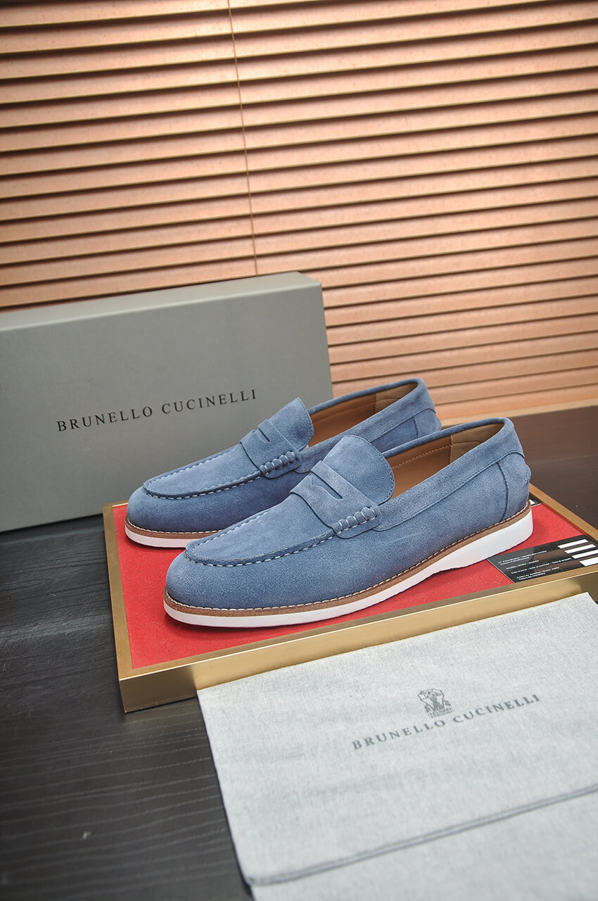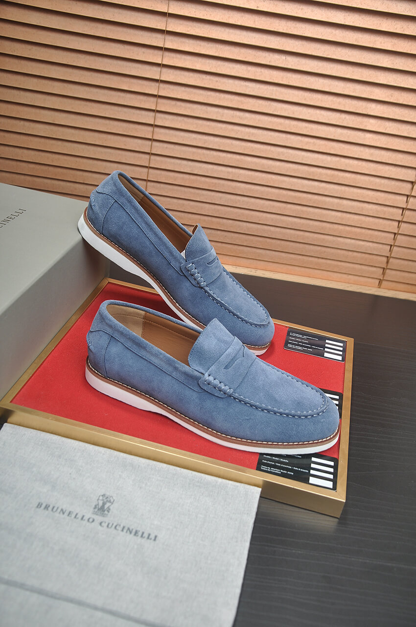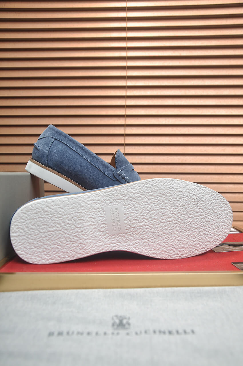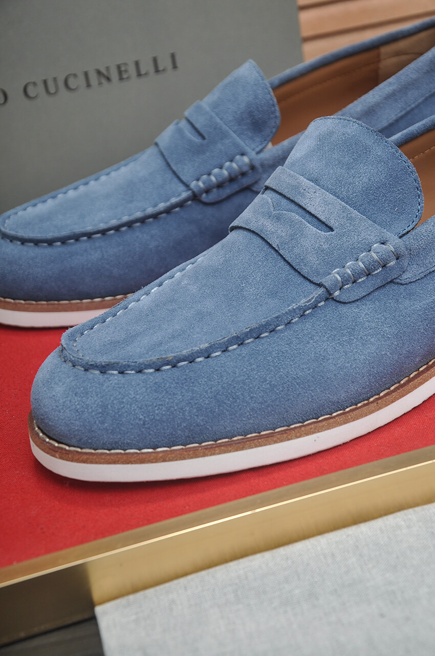 Step into the signature comfort and relaxed style of Italy with the Brunello Cucinelli Suede Penny Loafers in Light Blue. Available simultaneously with the official collection, these casual slip-ons are crafted from ultra-soft calfskin in a vibrant shade, embodying superior quality and timeless summer elegance.