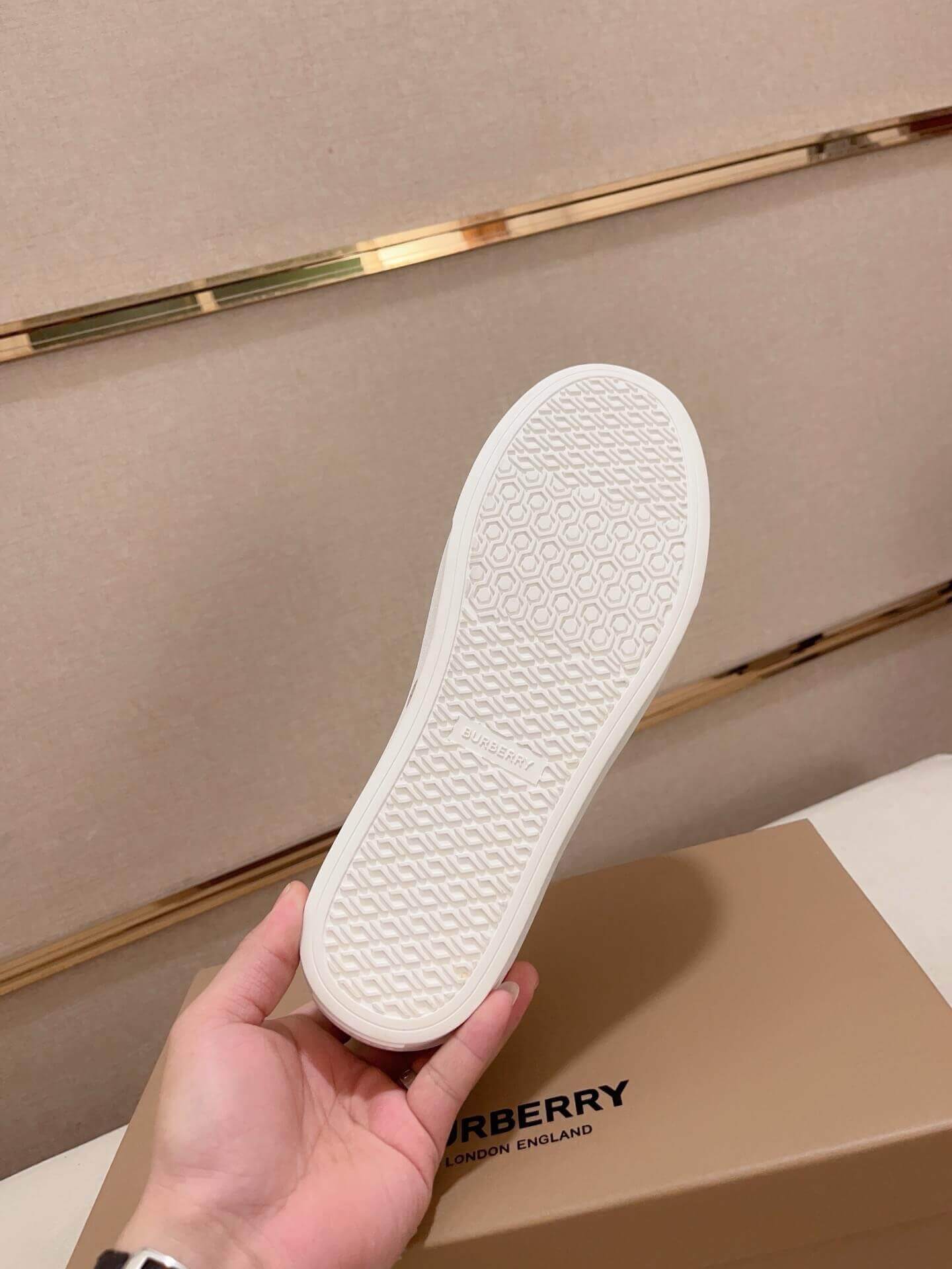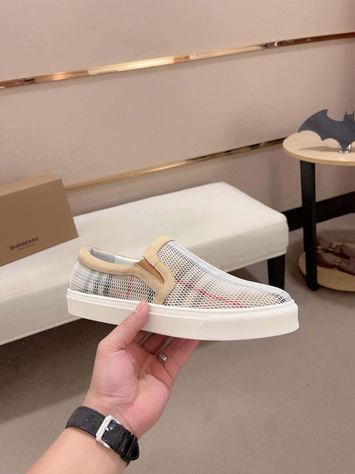 Embrace casual sophistication with these distinctive Burberry slip-on sneakers. The breathable mesh upper, subtly showcasing the iconic Burberry check pattern beneath, provides a comfortable and contemporary feel. Sleek beige suede accents at the sides and heel add a touch of refinement. A crisp white rubber sole offers a clean and versatile finish. These slip-ons offer a seamless blend of comfort and signature Burberry style.