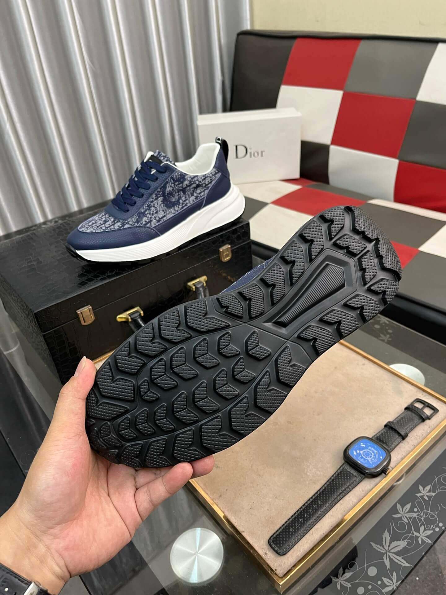Elevate your athletic and casual looks with the Dior Runner Sneaker, a bold fusion of performance design and iconic aesthetics. This dynamic low-top is presented in a rich blue, featuring luxurious blue leather accents seamlessly combined with panels of the signature blue and white Dior Oblique jacquard pattern, offering an instantly recognizable textural appeal. The design is completed with matching blue laces and subtle Dior branding, reinforcing its sophisticated craftsmanship. Set upon a chunky white rubber sole, this sneaker delivers both exceptional comfort and a cutting-edge high-fashion statement, making it an essential addition for the modern individual.