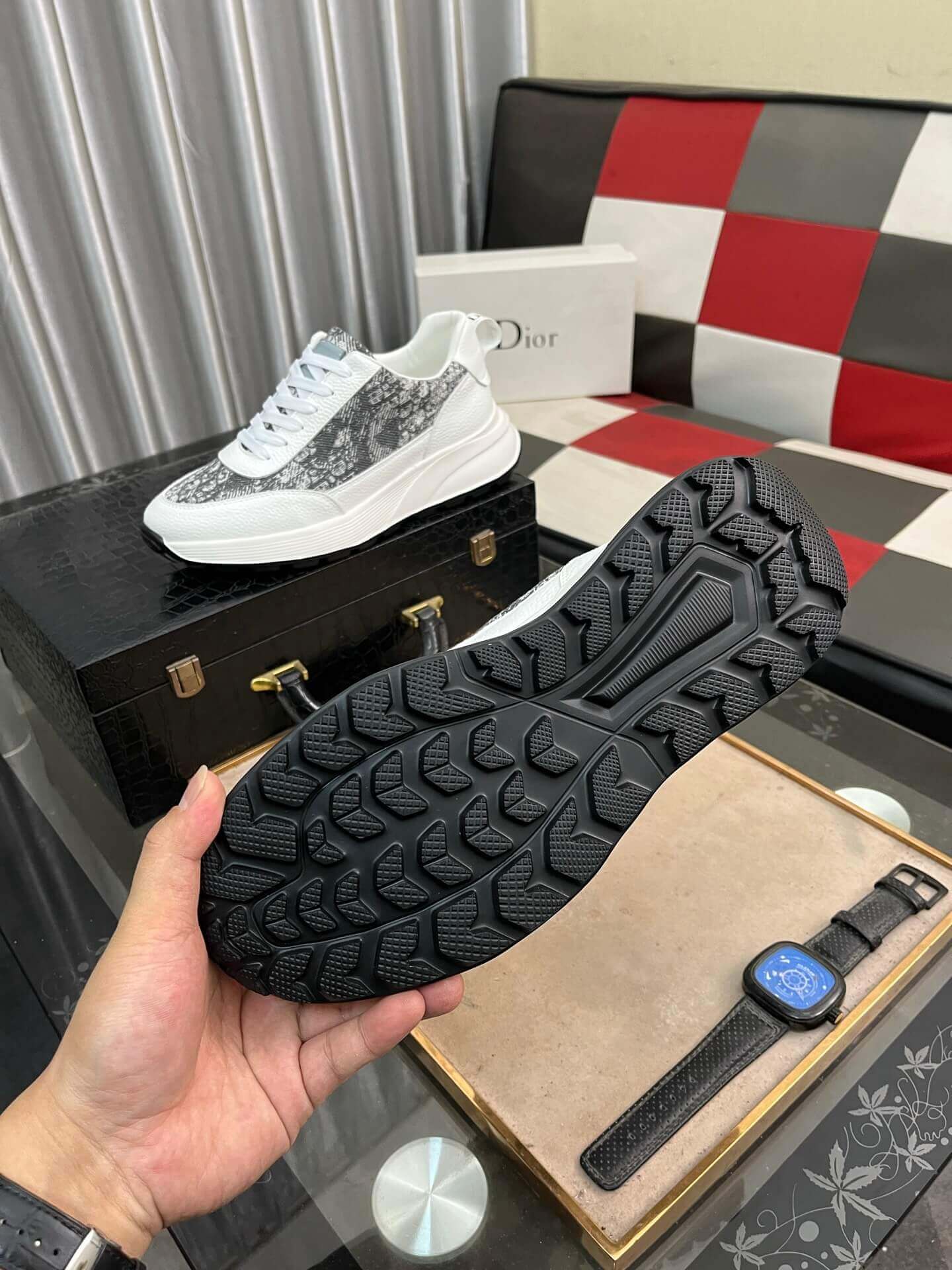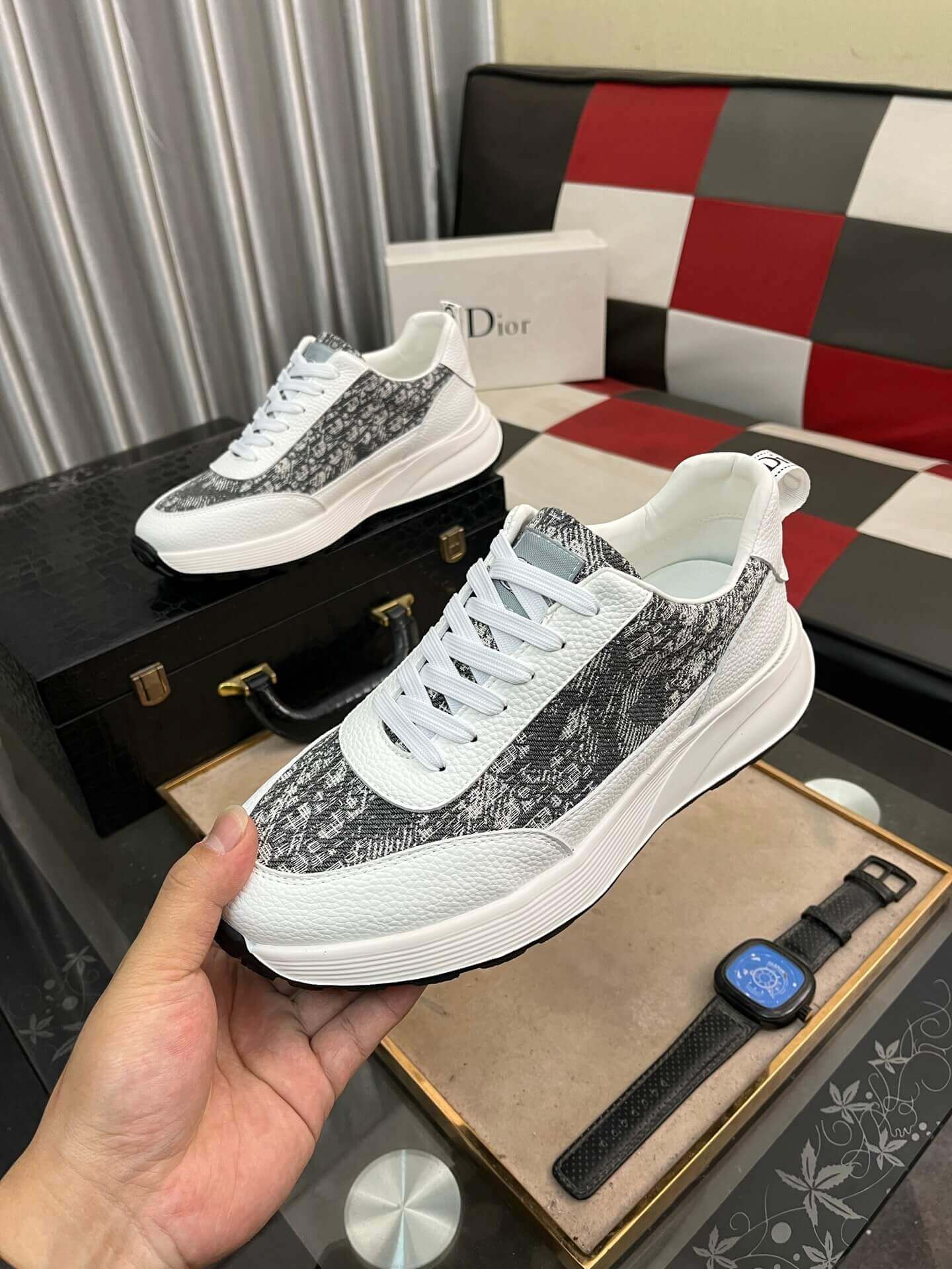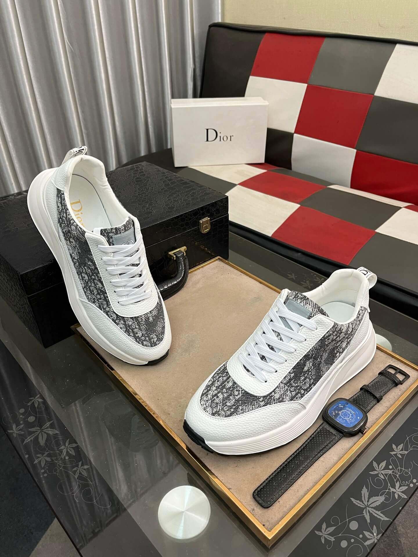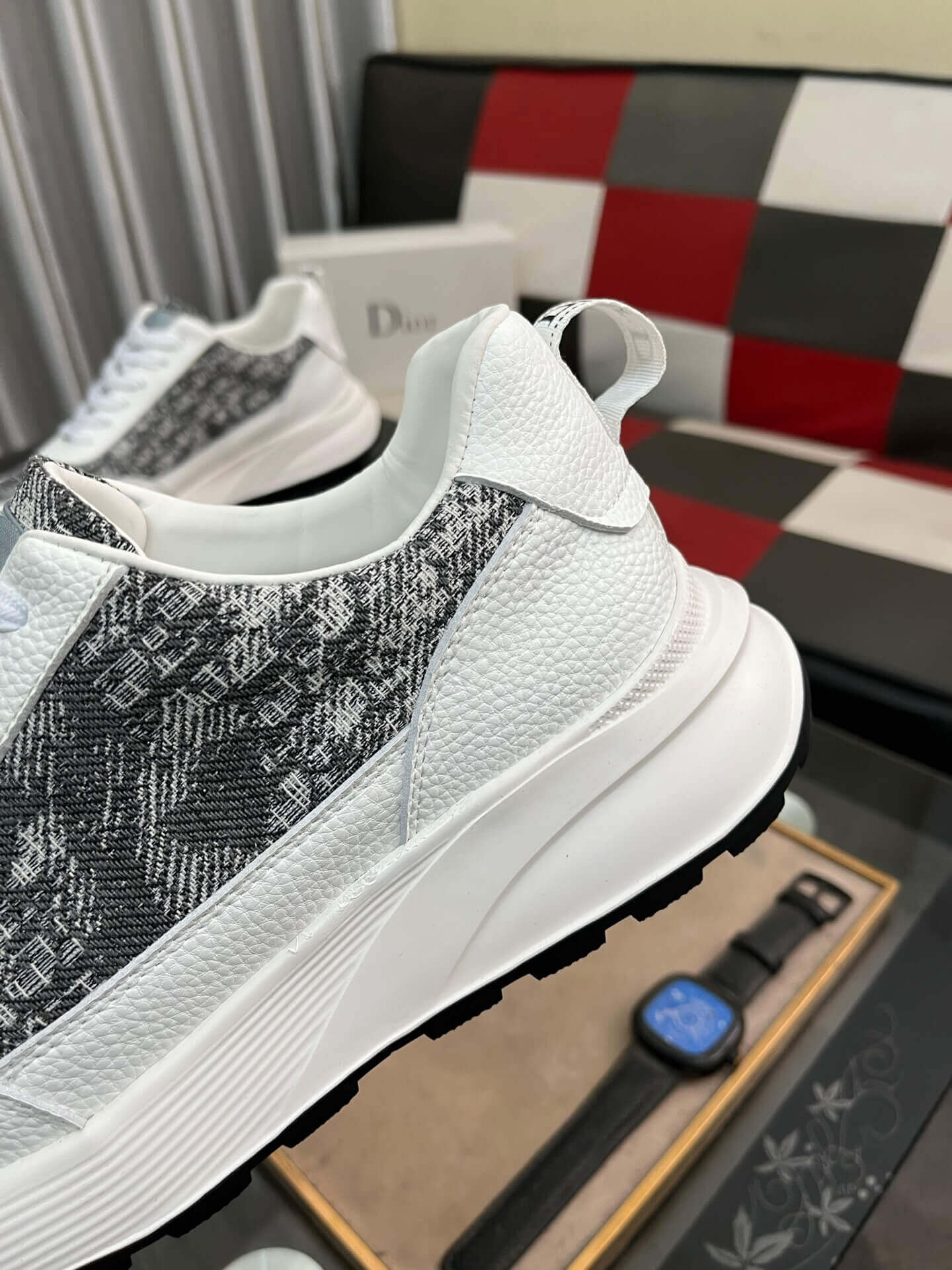 Step into sophisticated style with the Dior Sneaker, showcasing a captivating blend of iconic patterns and refined materials. This sleek low-top features a crisp white leather base, dynamically accented with panels of grey Dior Oblique jacquard across the sides and toe, providing a distinctive textured look. The design is completed with white laces and subtle Dior branding, enhancing its luxurious appeal. Built on a comfortable white rubber sole with a black outsole for contrast, this sneaker offers a harmonious fusion of contemporary aesthetics and everyday comfort, making it an exceptional addition to any discerning wardrobe.