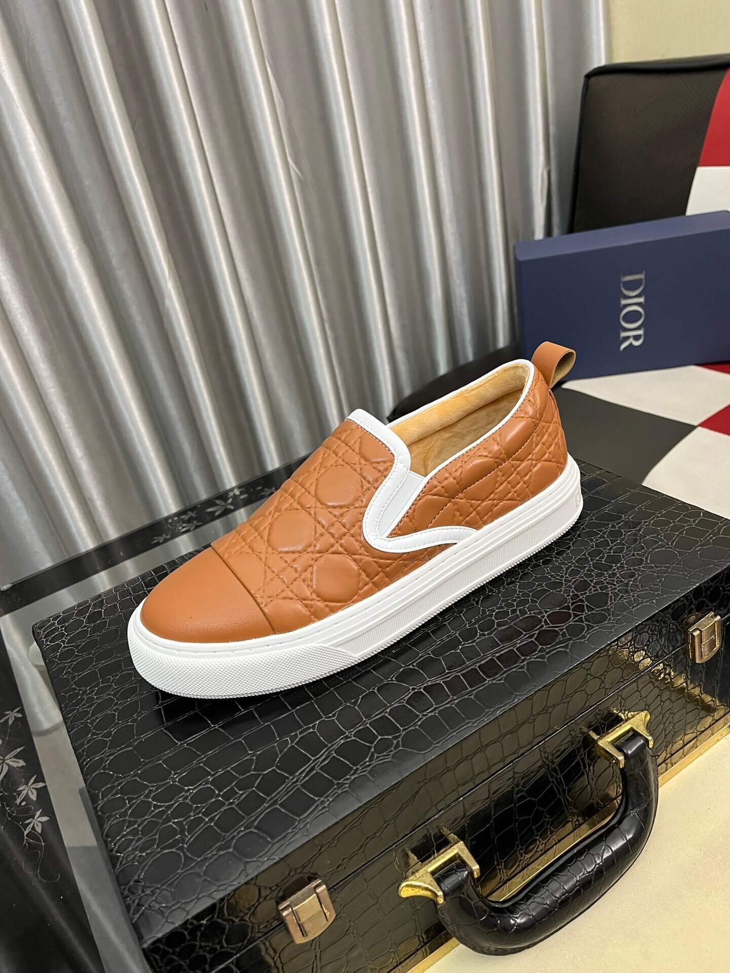 The definitive luxury slip-on, the Dior Solar Sneaker is crafted from supple brown calfskin leather meticulously embossed with the House’s signature Cannage motif. This streamlined, effortless design offers immediate comfort and a sophisticated textural statement, making it an essential and highly recognizable piece of Dior footwear.