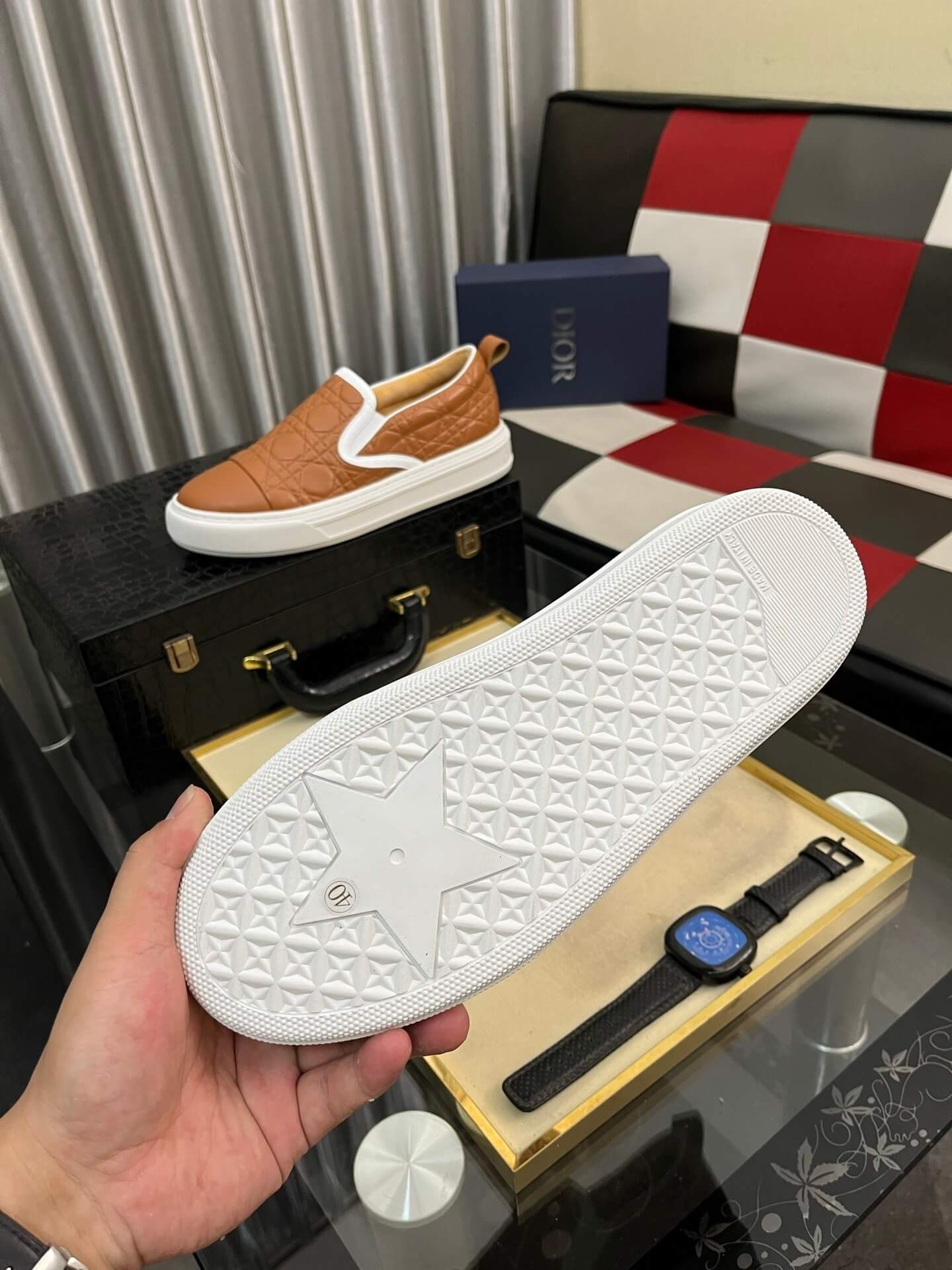 This Dior Brown Cannage Solar Sneaker is a testament to Dior’s legacy of infusing heritage motifs with contemporary, functional design. The use of the distinguished Cannage motif on a casual silhouette creates a unique piece that is both relaxed and profoundly luxurious. Meticulously crafted in Italy, this slip-on is an indispensable investment, ensuring effortless style, superior quality, and the lasting prestige of Dior footwear.
