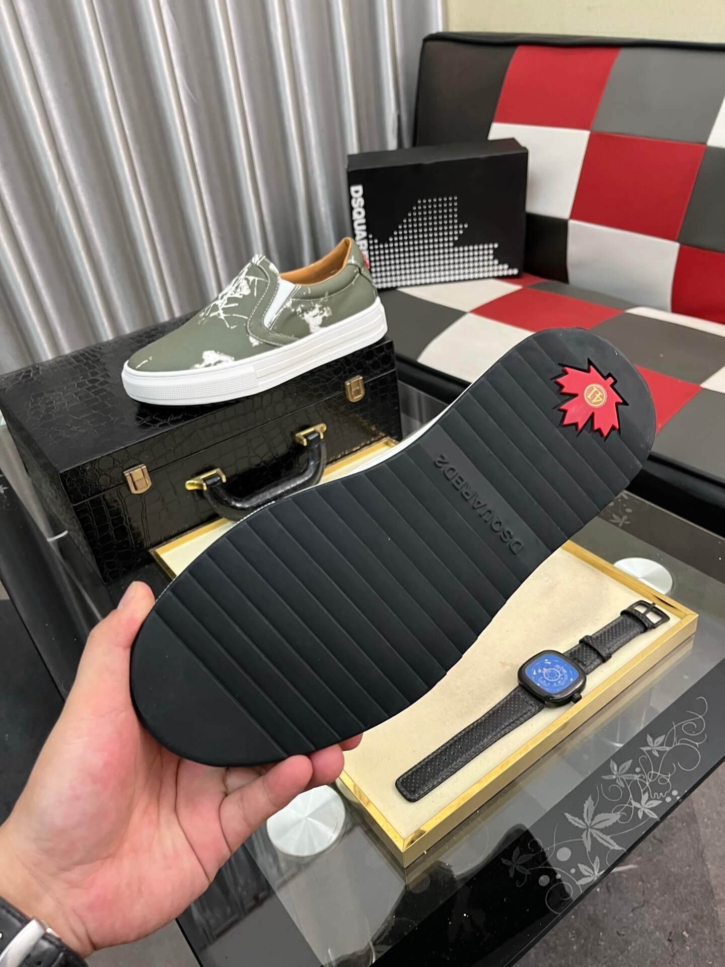 The Pop Tux Slip-On in Olive Canvas is an essential acquisition for the fashion-forward individual who values artistic expression. The deliberate contrast between the sturdy olive canvas and the abstract white paint splatters creates a visual energy that is unmistakably DSQUARED2. This shoe is engineered for versatility and comfort, featuring a clean leather interior lining and a thick, supportive sole. Whether you pair it with tailored black trousers or light summer shorts, this slip-on is the perfect piece to anchor an eclectic look with a dash of confident luxury and modern attitude.
