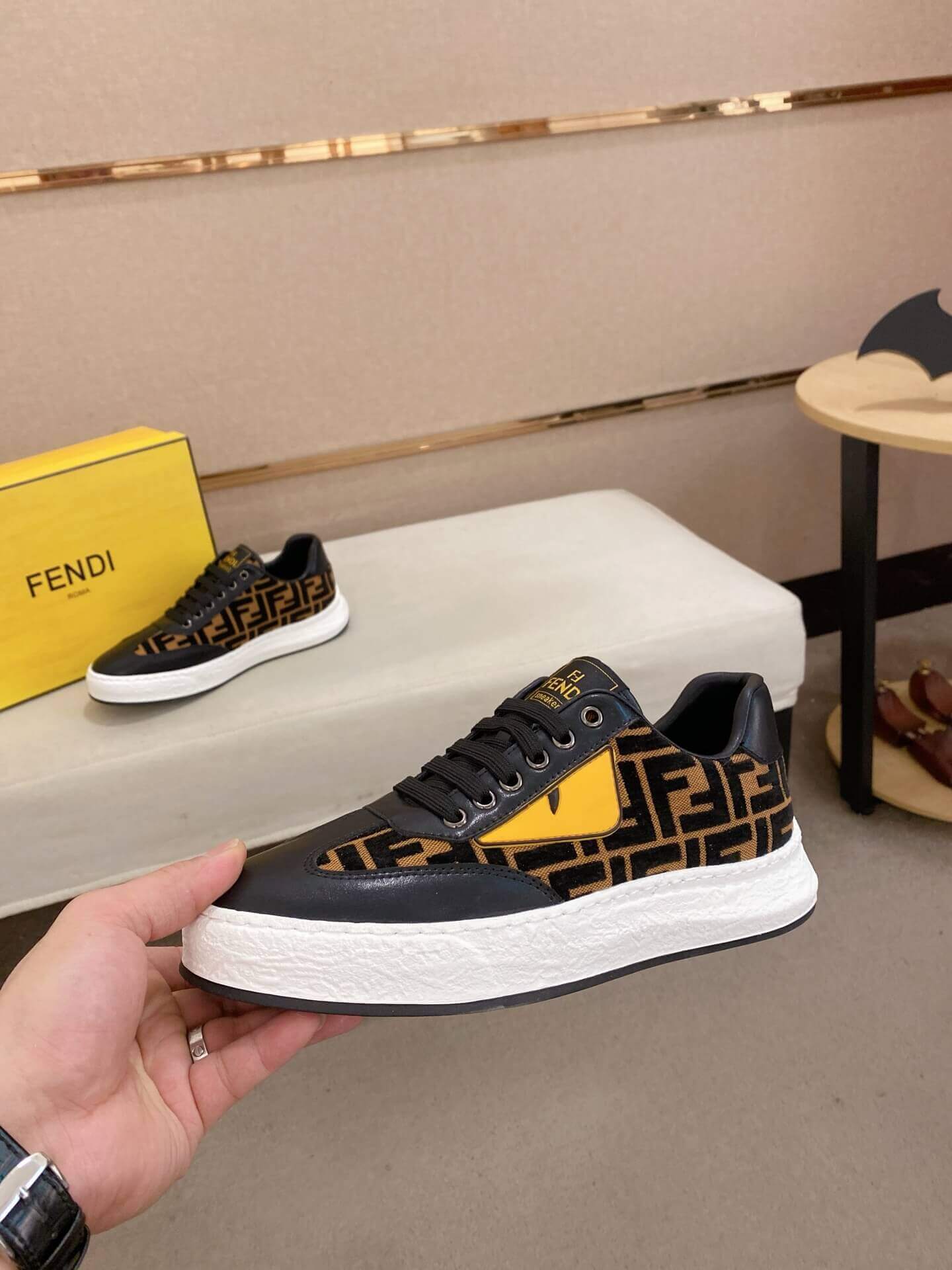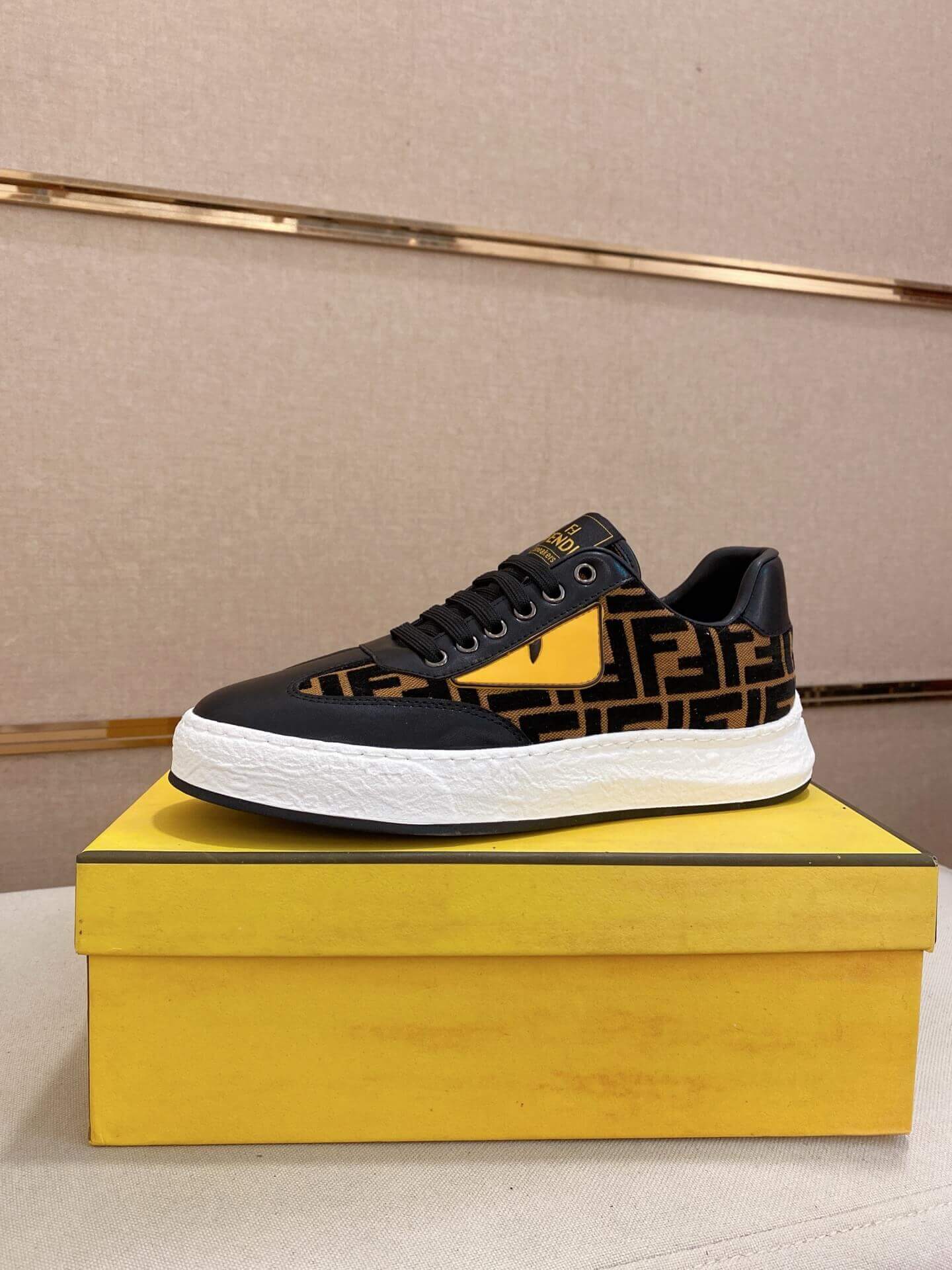 Elevate your sneaker game with these distinctive Fendi Match sneakers, showcasing the iconic FF jacquard pattern in rich shades of brown and black. Sleek black leather accents provide a sophisticated contrast, while a signature yellow “Peekaboo” eye motif playfully peeks from the side, adding a touch of whimsical Fendi character. The crisp white rubber sole offers a clean foundation, ensuring these lace-up sneakers deliver both standout style and comfortable wear.