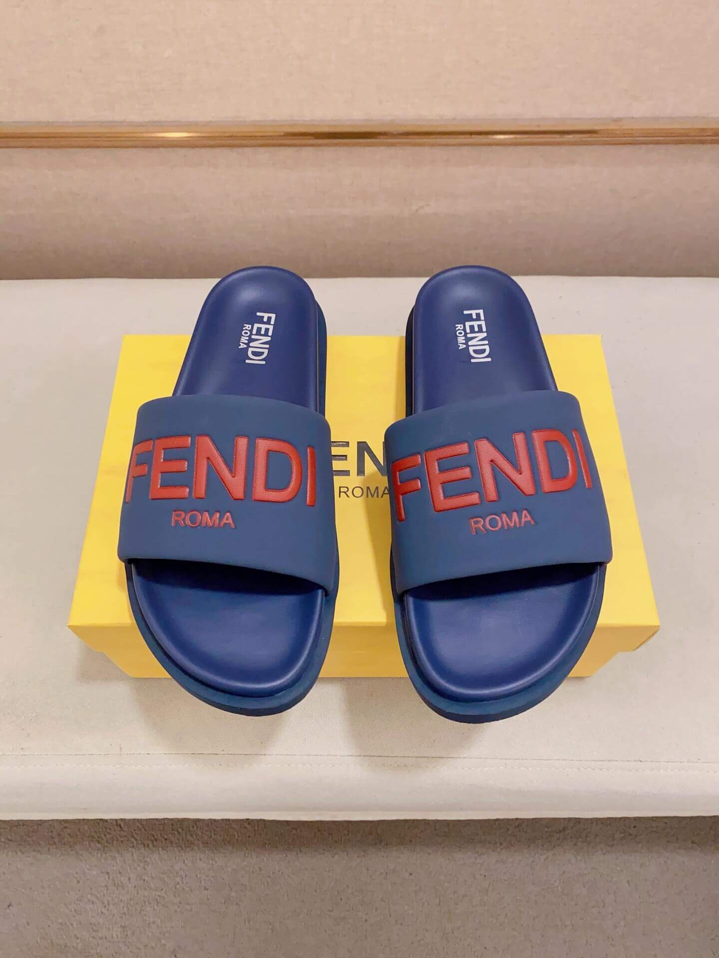 Experience refined comfort with these striking Fendi Roma slides. The deep blue strap is boldly adorned with “FENDI ROMA” lettering in a vibrant orange hue, creating an unmistakable statement. The comfortable, contoured footbed also features a matching deep blue, providing a cohesive and stylish look. Perfect for adding a touch of luxury to your casual ensemble, these slides combine a rich color palette with iconic branding for distinctive appeal.