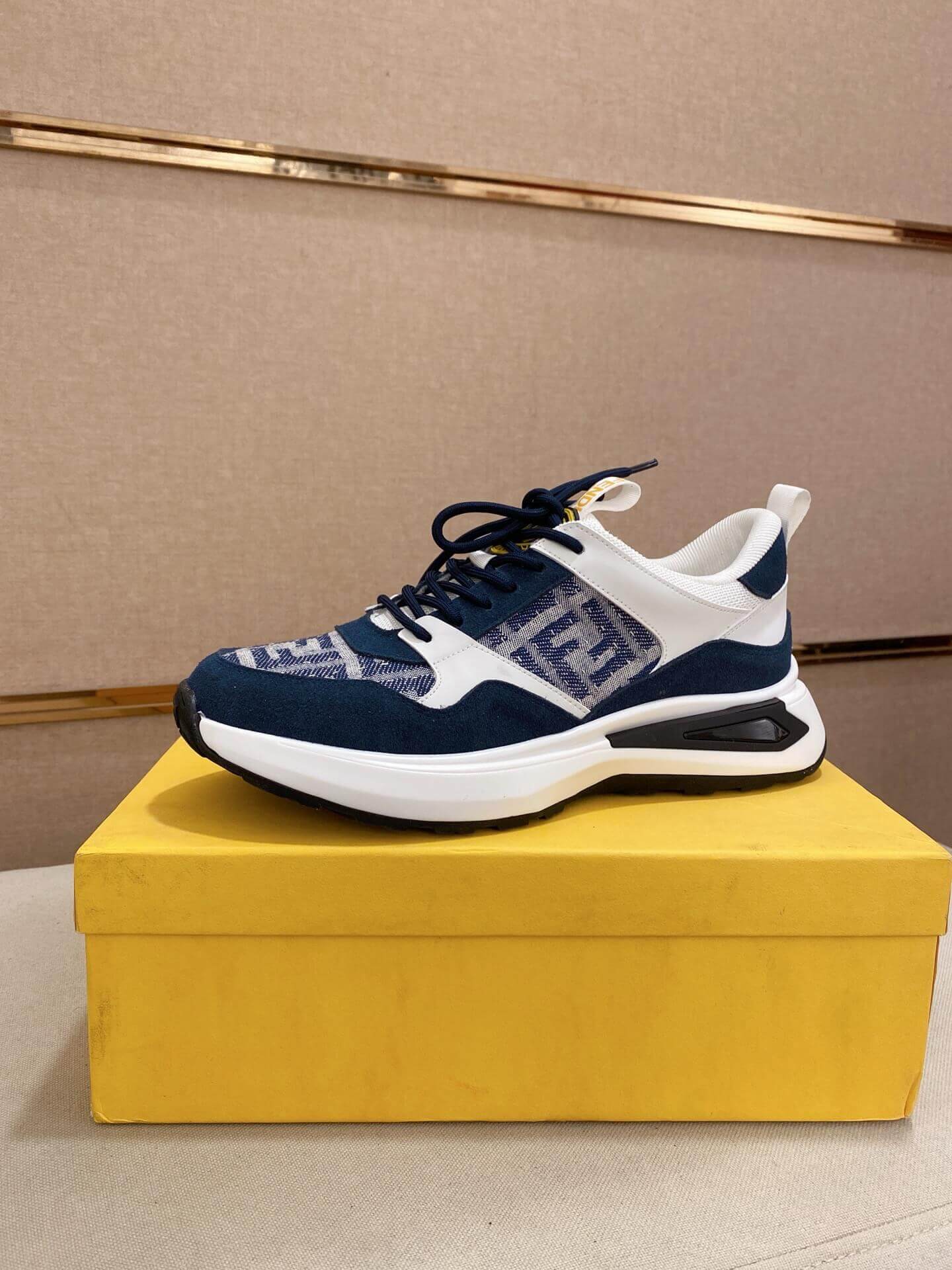 Elevate your everyday stride with these striking Fendi Run sneakers, a dynamic fusion of sporty design and signature elegance, now available in Eldoret. The upper features panels of deep navy blue suede contrasted with crisp white leather, creating a visually impactful color-blocked aesthetic. The iconic Fendi FF jacquard is strategically placed, adding a touch of unmistakable luxury to the side panels. A vibrant yellow accent with “FENDI” branding graces the tongue. The contemporary white midsole, paired with a black and grey segmented outsole, not only provides a modern silhouette but also ensures comfortable support for navigating the bustling streets of Eldoret or enjoying a relaxed day. Lace up in style with these trainers that effortlessly blend high-fashion appeal with everyday practicality.