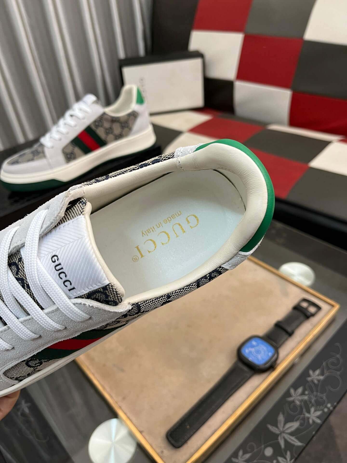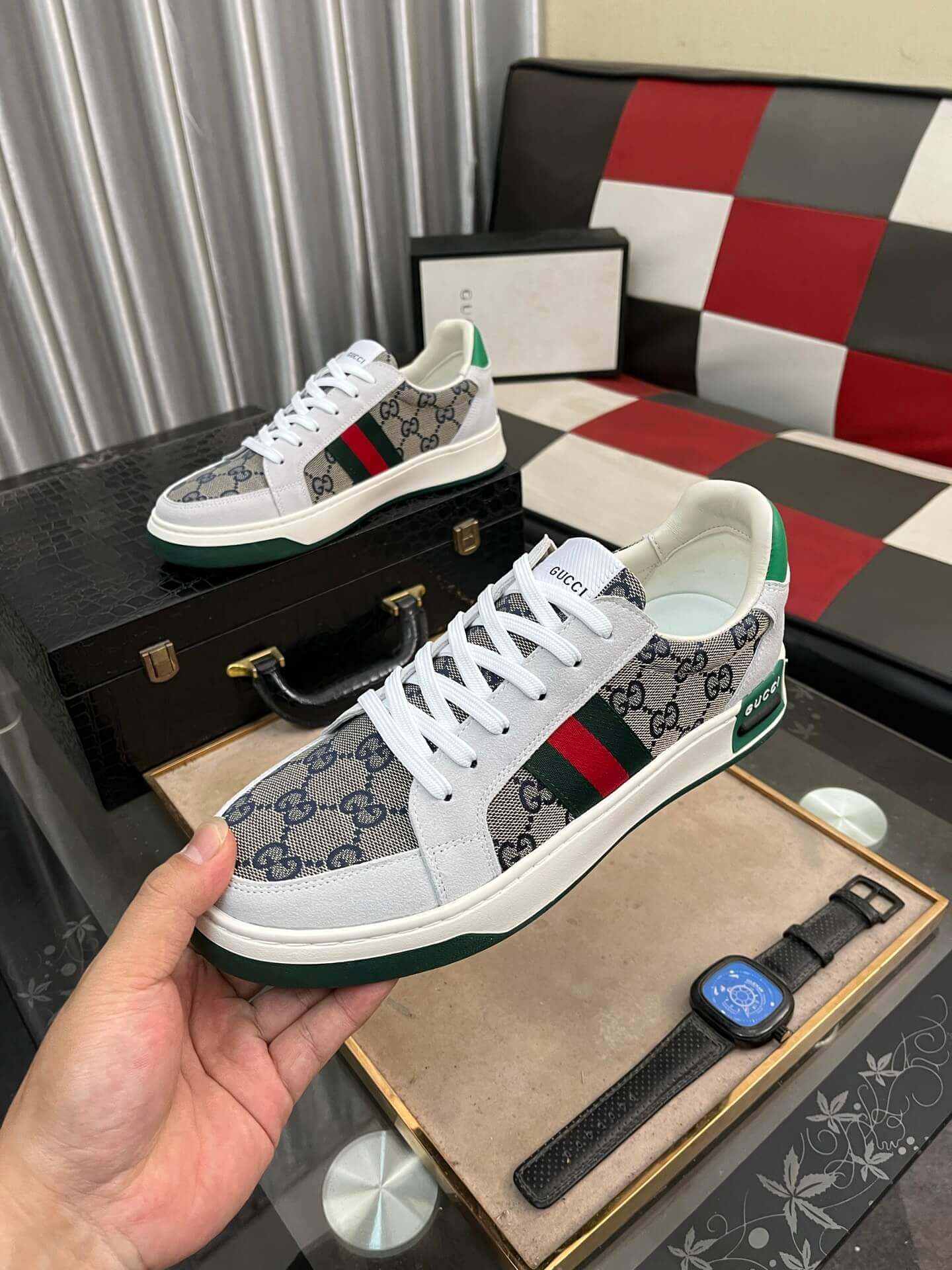 Refine your casual style with the Gucci Ace Sneaker, a contemporary twist on a beloved classic. This distinctive low-top features the iconic Grey GG Supreme canvas across its upper, offering a sophisticated and recognizable pattern. Crisp white leather accents at the toe, laces, and heel provide a clean contrast, while the signature green and red Web stripe proudly adorns the sides, cementing its esteemed heritage. Grounded by a sleek white sole, this trainer offers a harmonious blend of modern aesthetics and timeless appeal, perfect for the discerning individual.