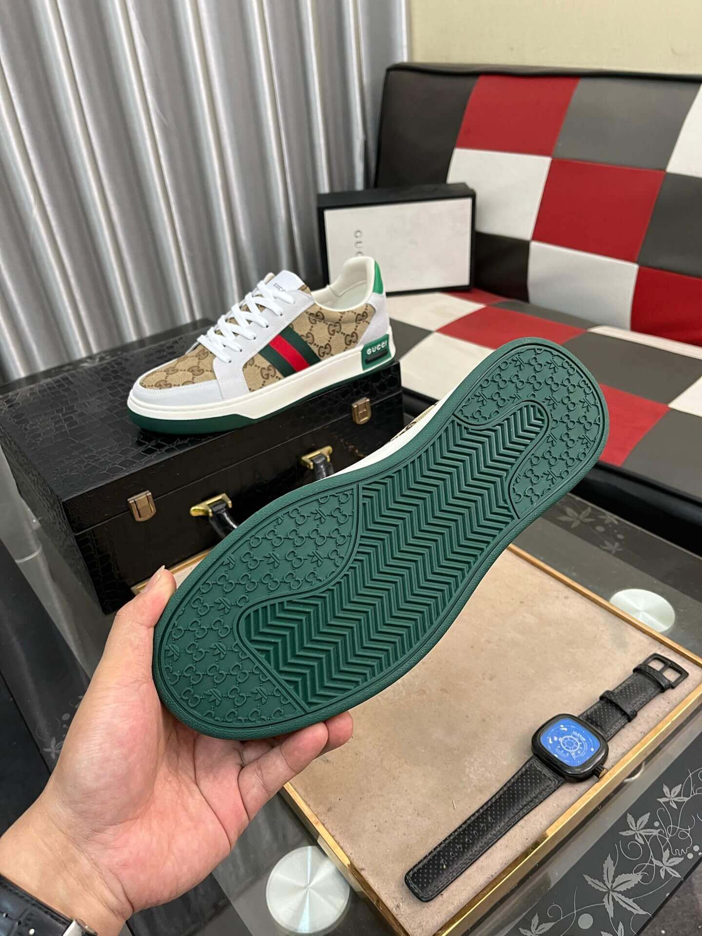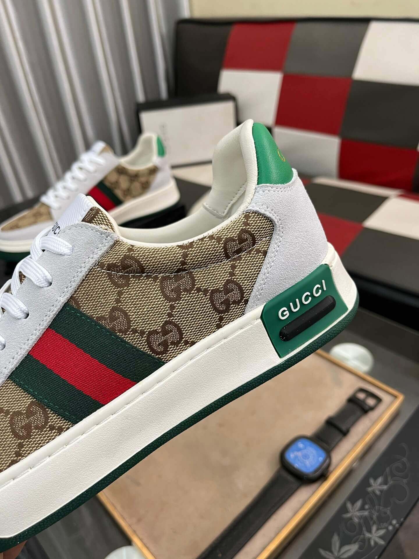 This Gucci Ace Sneaker, a timeless silhouette celebrated for its distinguished design, represents classic luxury. This iconic low-top features the instantly recognizable Beige and Ebony GG Supreme canvas throughout its upper, showcasing the House’s rich heritage. The sneaker is impeccably framed by pristine white leather accents on the toe and heel, providing a crisp contrast. Adorning the sides is the signature green and red Web stripe, an unmistakable emblem of Gucci’s legacy. Finished with a sturdy white sole and matching white laces, this trainer offers a sophisticated yet versatile aesthetic, perfect for elevating any ensemble.