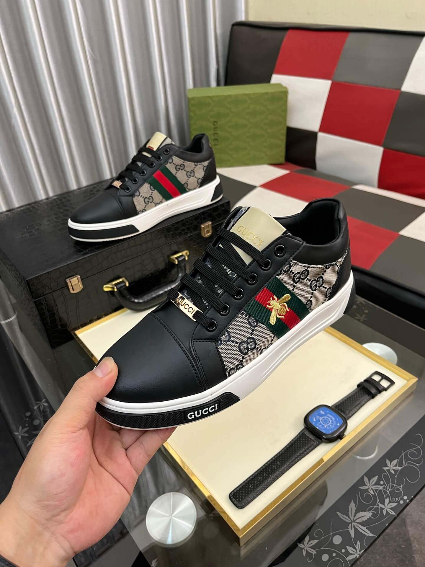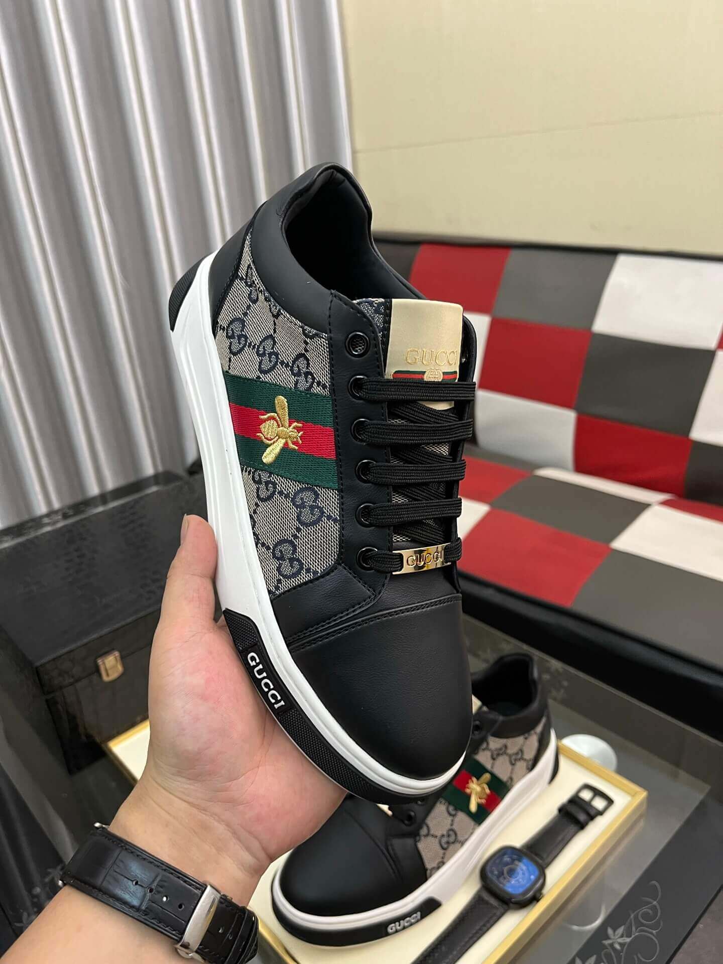 Command attention with a stroke of sophisticated whimsy. These sneakers are a luxurious whisper of confidence, designed to infuse your every step with an intriguing blend of heritage and contemporary allure. Enjoy the sleek embrace of black leather, perfectly accented by the iconic ebony GG canvas, and the whimsical golden bee motif making a subtle, yet unforgettable statement.
