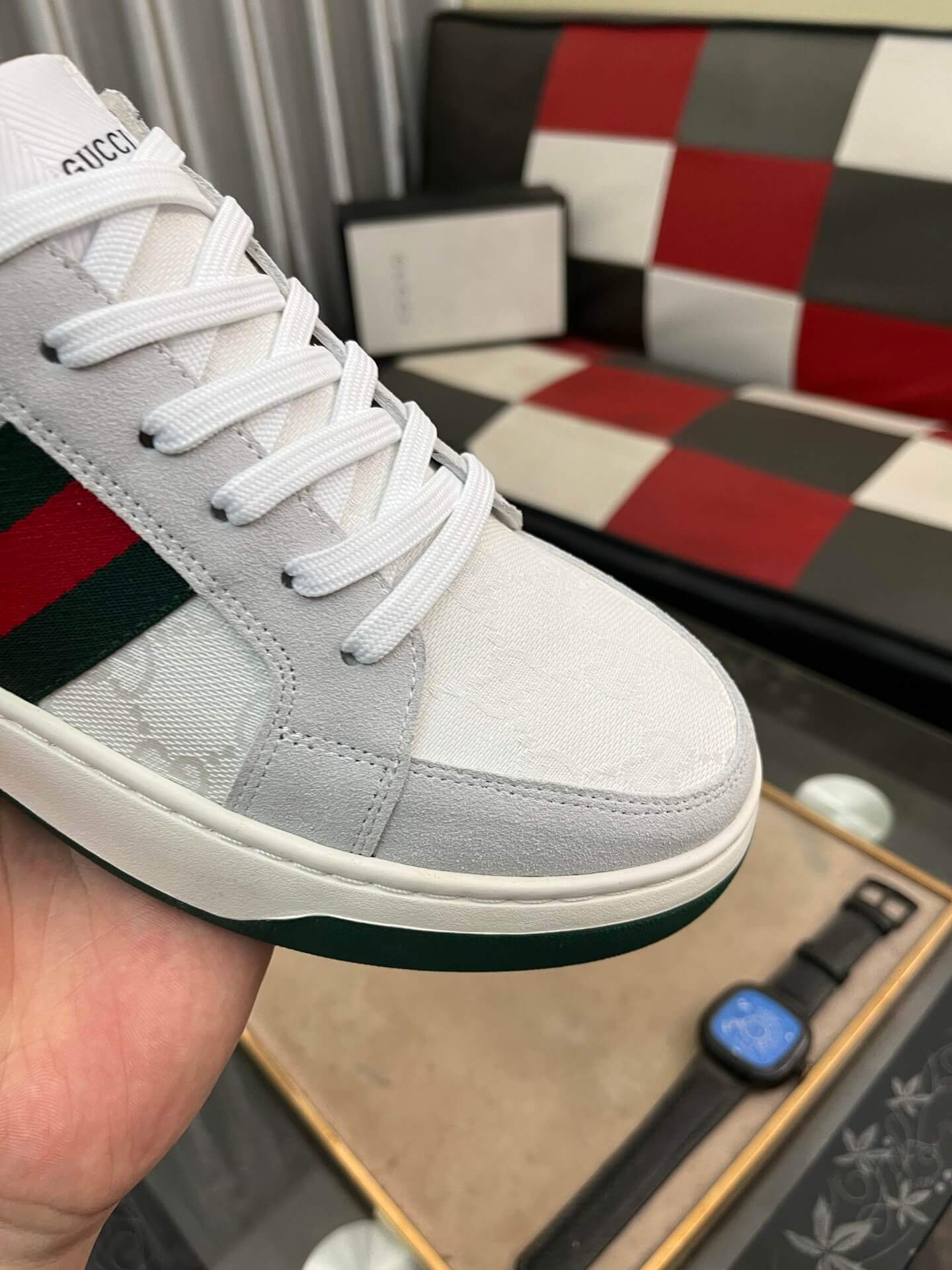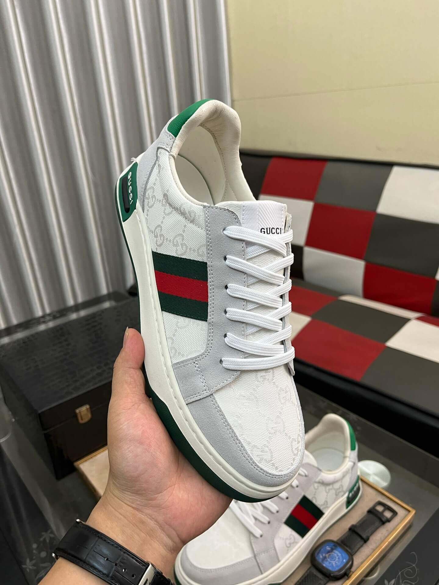Experience enduring style with the Gucci Ace Trainer, a classic silhouette recognized for its clean lines and iconic details. This pristine white leather sneaker features the unmistakable green and red Web stripe adorning its sides, a signature emblem of the House’s heritage. Subtle tonal GG embossing graces the white leather, adding a touch of discreet luxury to the streamlined design. Grounded by a contrasting green trim on the sole, this trainer offers a sophisticated yet versatile aesthetic, ensuring effortless elegance with every step.