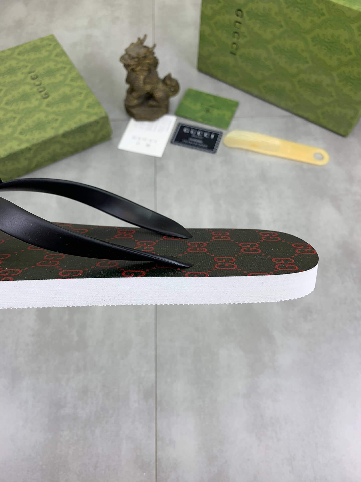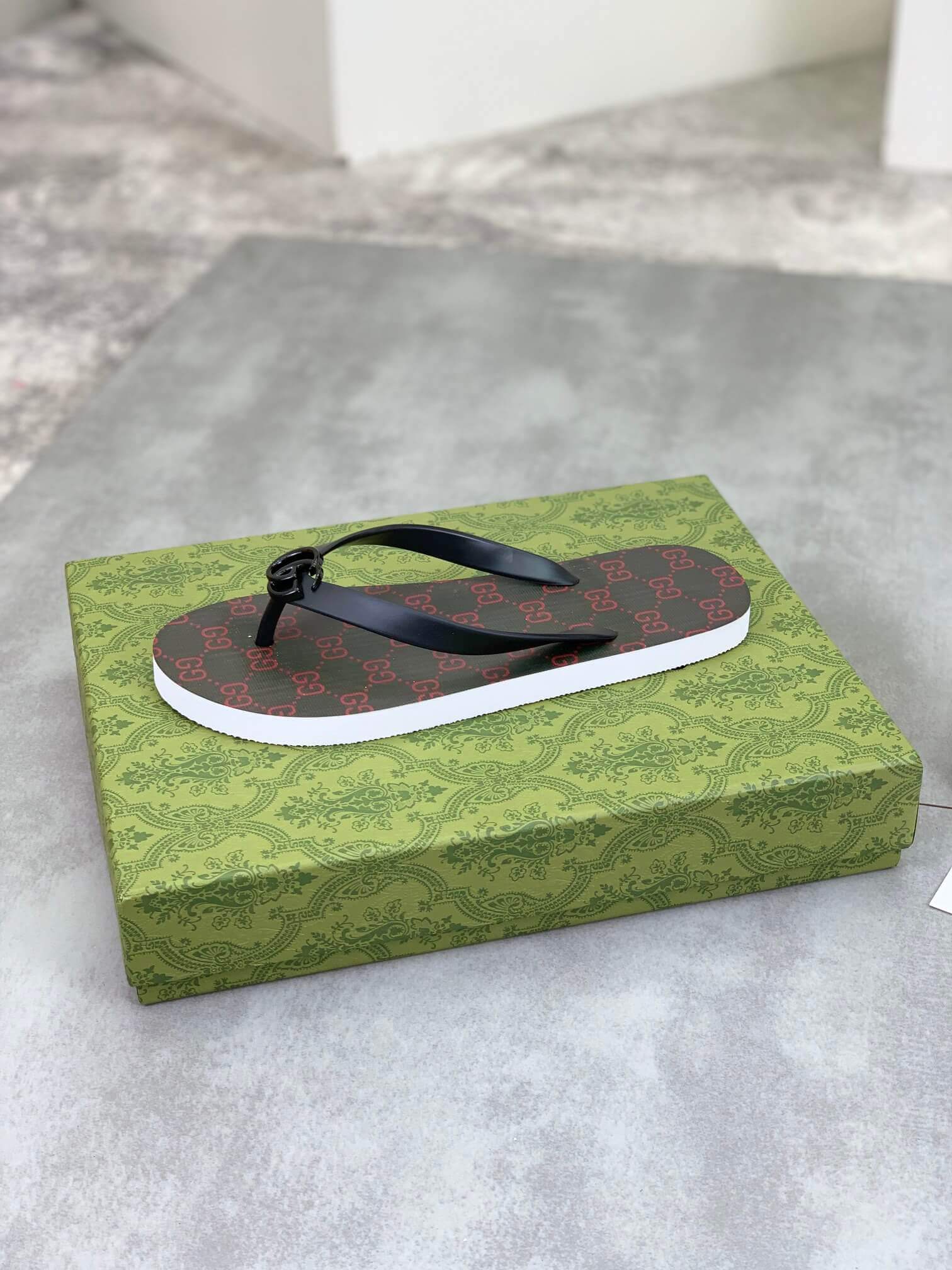 A visual symphony of signature design, these Gucci thong sandals marry iconic branding with a compelling color palette. The sleek black strap is elegantly centered by the instantly recognizable Double G hardware, a powerful emblem of the House’s heritage. Beneath your foot, the sole features a dynamic jacquard pattern, with the interlocking GG motif rendered in a rich vibrant red rendered against a charcoal black backdrop. This bold interplay of hues and pattern creates a distinctive textural appeal that’s both classic and fiercely modern. Perfect for leisurely moments by the water or adding a confident pop of personality to your casual ensembles, these sandals effortlessly combine supreme comfort with an iconic design, ensuring you leave a memorable, spirited impression wherever your relaxation takes you.