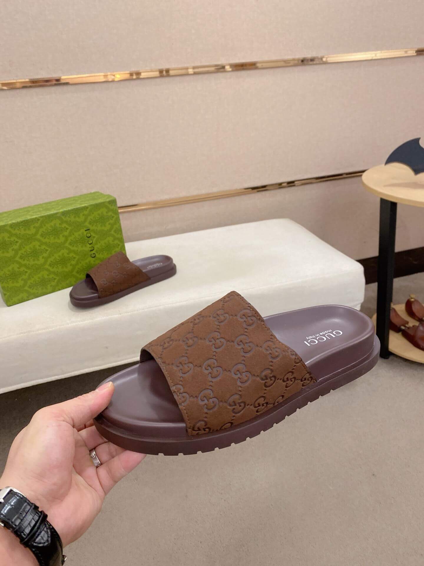 The Gucci Brown GG Suede Slide Sandal is a masterclass in understated luxury. The wide, comfortable strap is crafted from a plush brown suede-like material, subtly yet entirely embossed with the iconic Gucci GG monogram pattern, creating a rich textural depth that’s both classic and inviting. The tonal brown footbed ensures seamless comfort for prolonged wear, providing a soft landing with every step. Perfect for leisurely moments by the water, sophisticated at-home relaxation, or adding a touch of discerning style to your casual ensembles, these slides embody a casual elegance that is unmistakably Gucci.