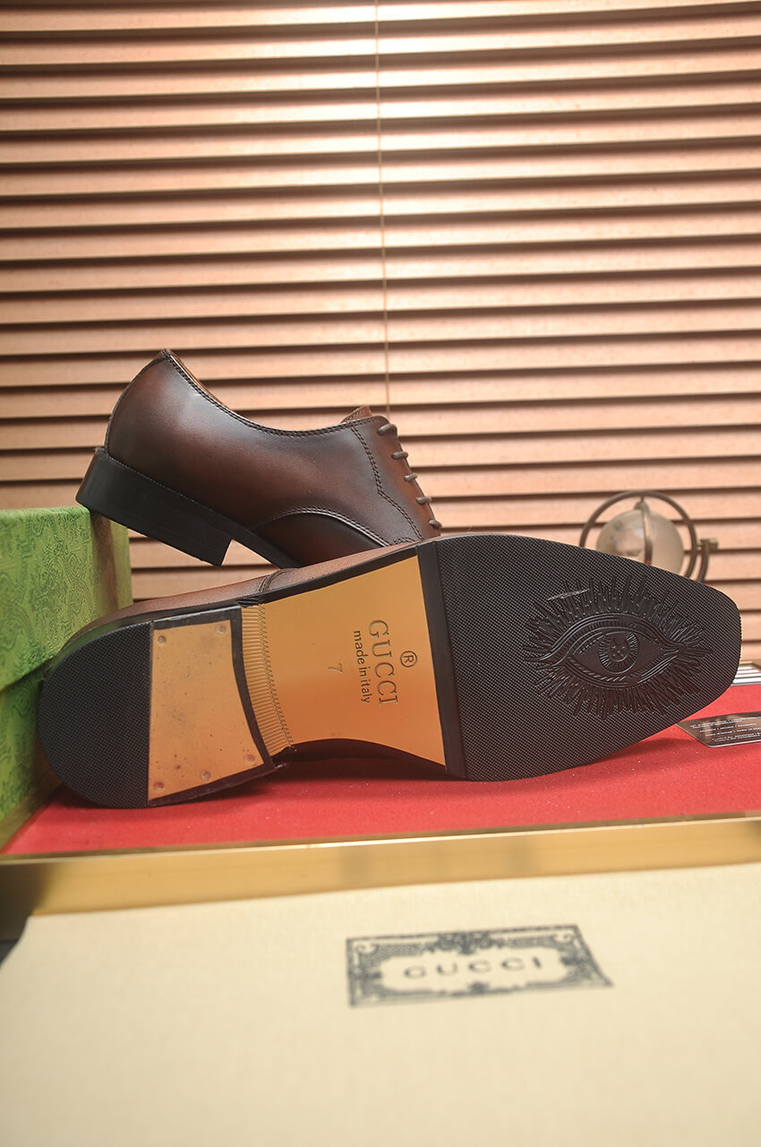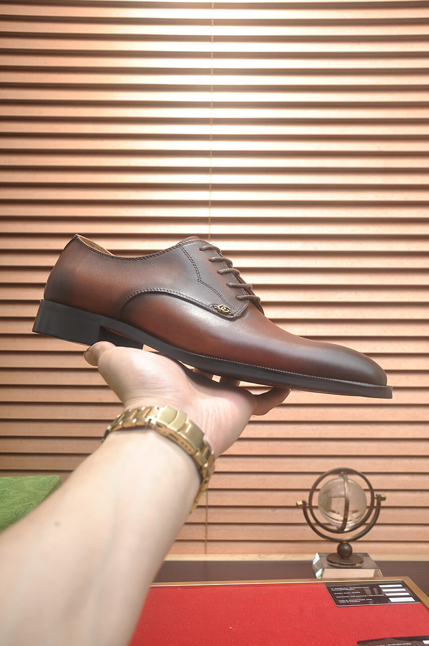 Elevate your formal and smart-casual looks with the exquisite Gucci Leather Derby Shoes with Logo Hardware in Brown. Crafted to Original Quality standards, this shoe embodies Italian luxury with its superior materials and refined aesthetic, making it a premium addition to any wardrobe.