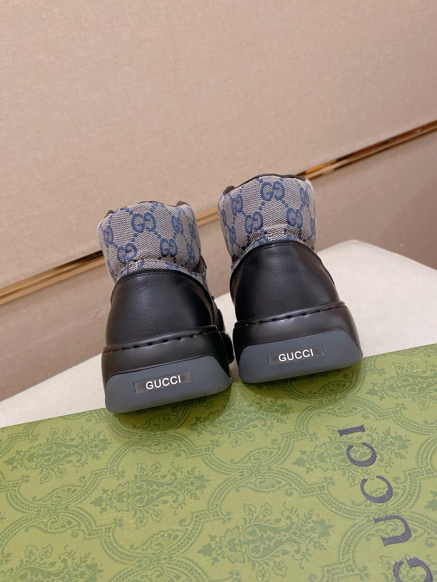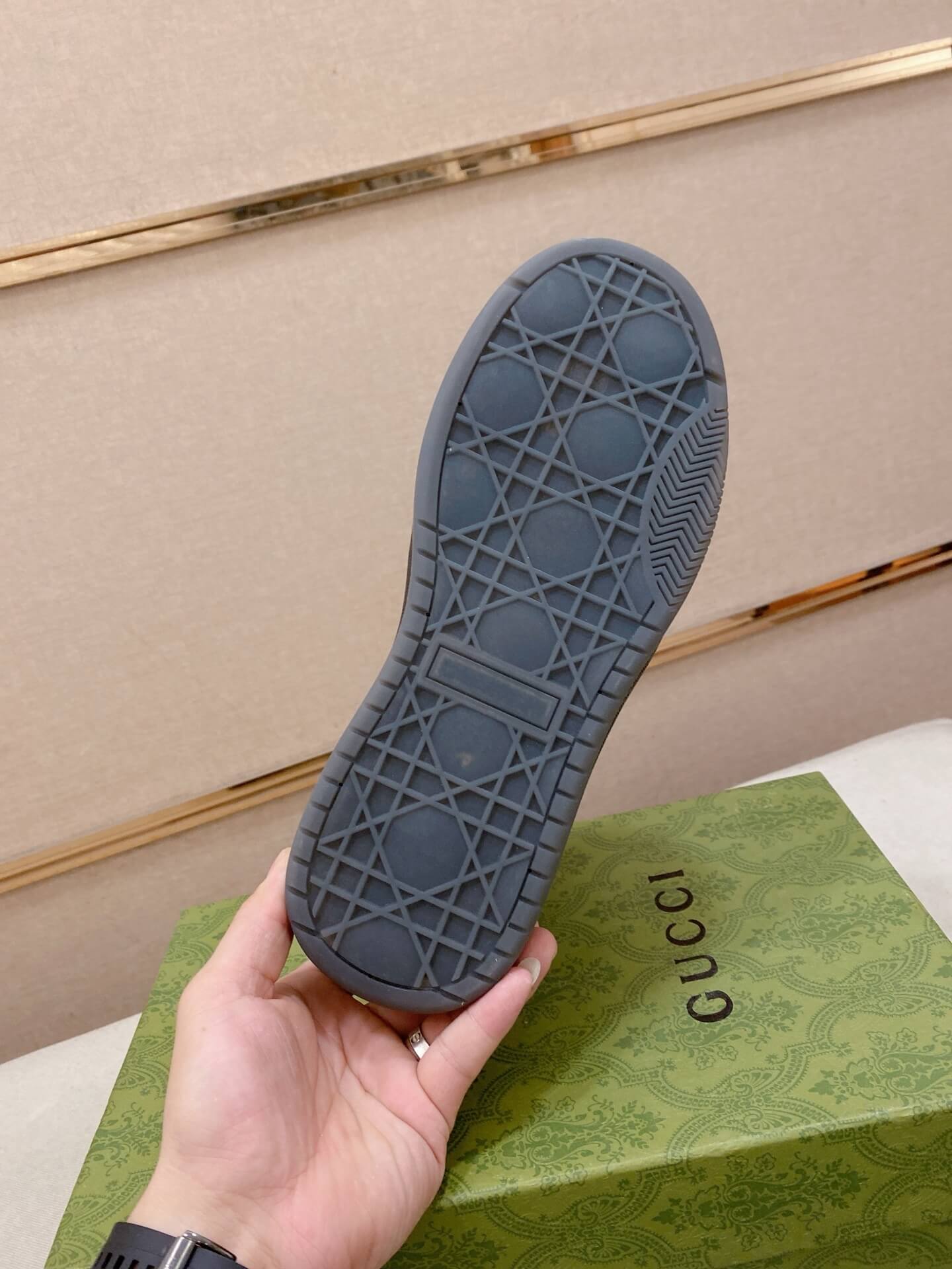 - Archival GG Canvas: The main body of the shoe is crafted from the signature Beige/Ebony GG Monogram canvas, a durable material that is synonymous with the brand’s rich history and style.