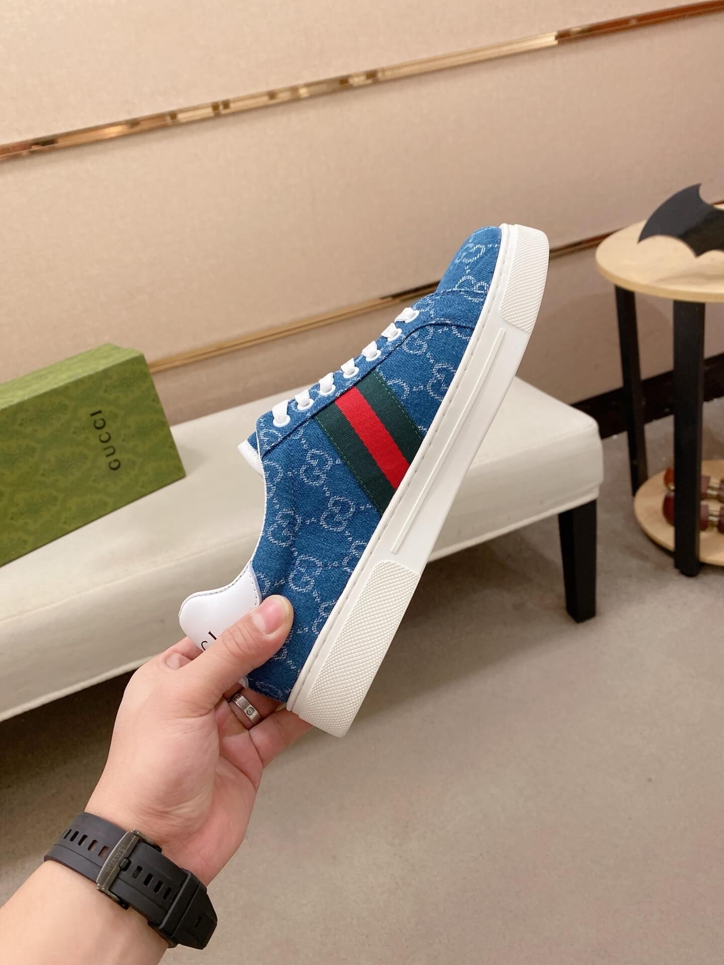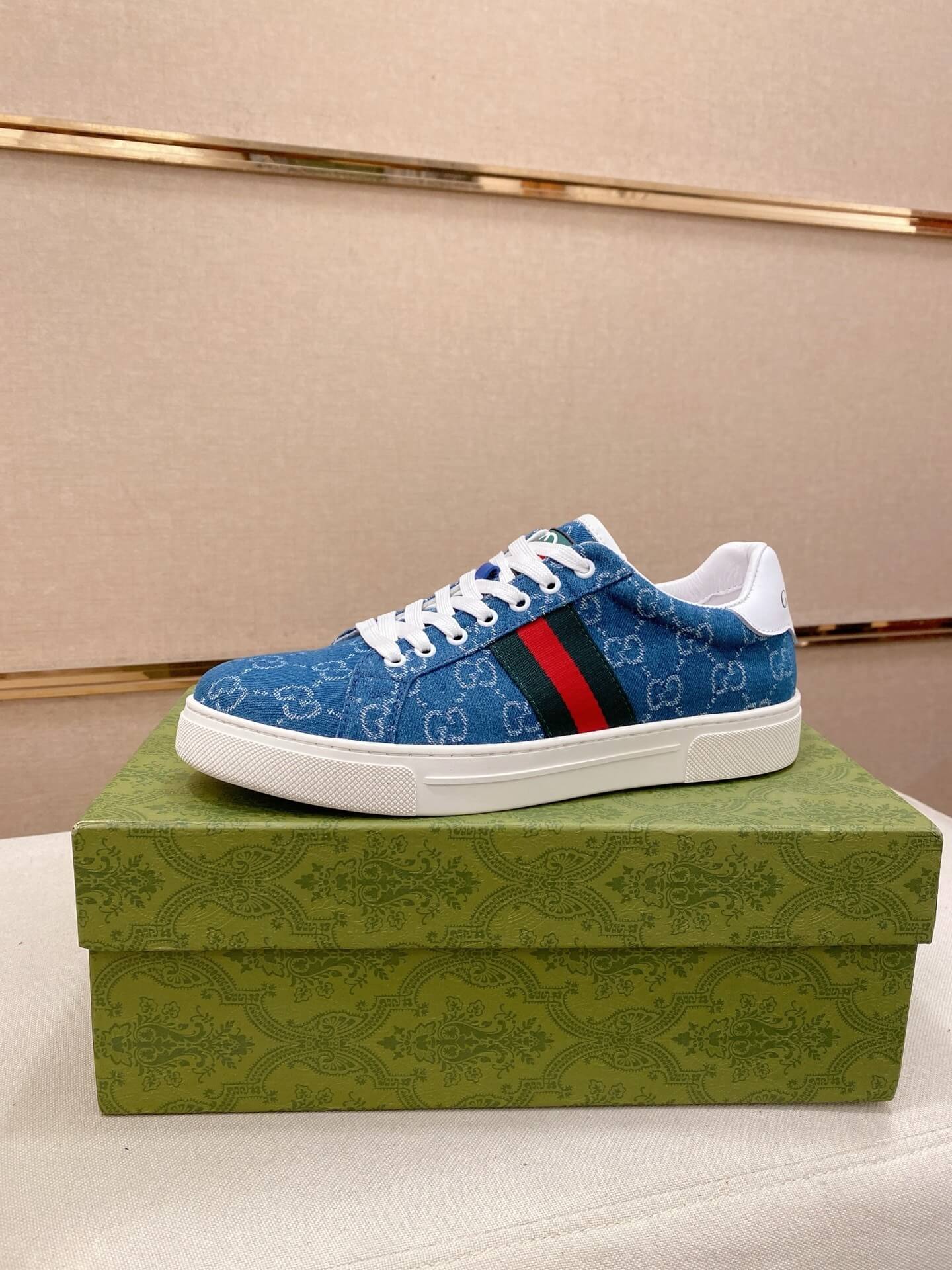 Distinct Blue/Gray GG Canvas: The canvas upper showcases the classic GG Monogram pattern in a unique, subtle blue/gray tone, offering a fresh deviation from the standard beige/ebony.