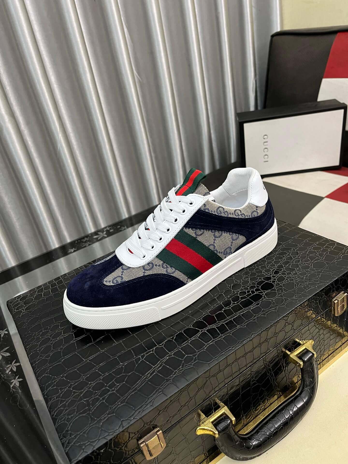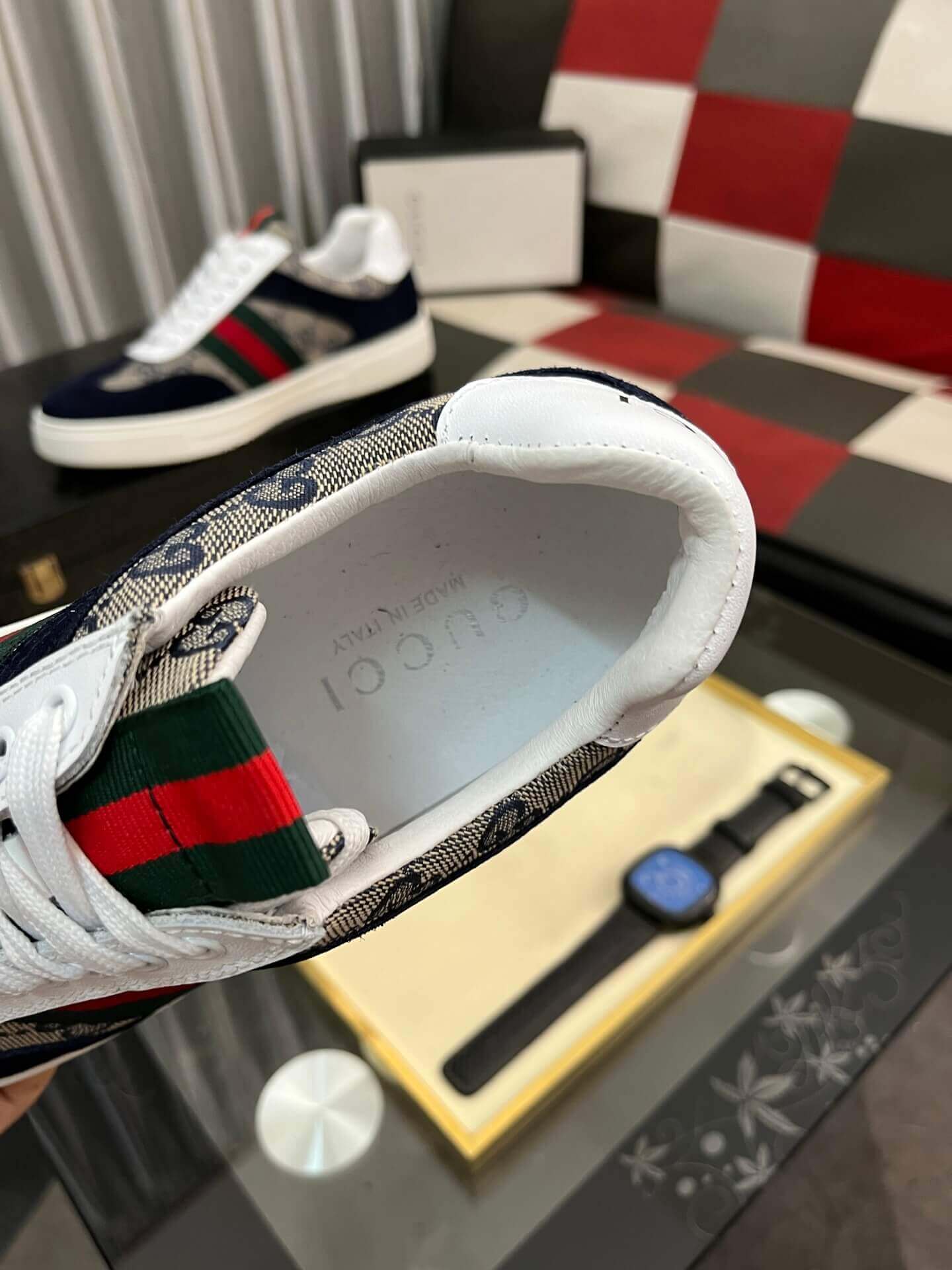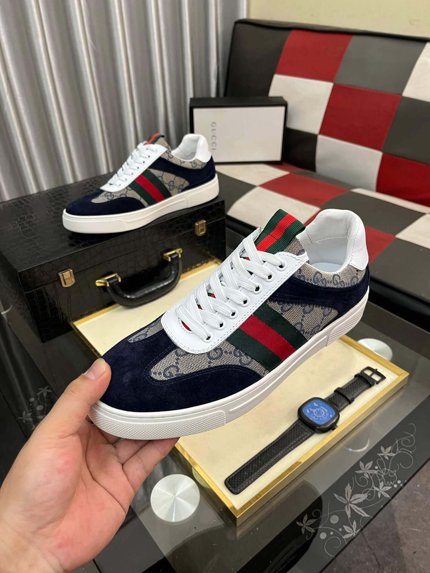 - Sophisticated Material Mix: Featuring sleek black suede expertly combined with the classic beige and blue GG Canvas, these sneakers present a unique and refined aesthetic.