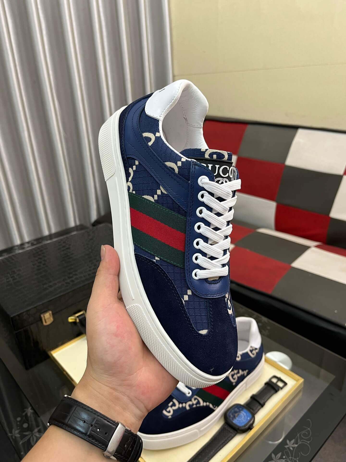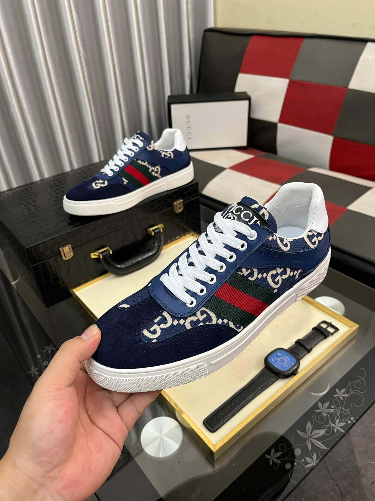 - Distinctive Material Combination: The upper showcases a rich blue suede beautifully contrasted with beige and blue GG Canvas, creating an eye-catching visual and tactile experience.