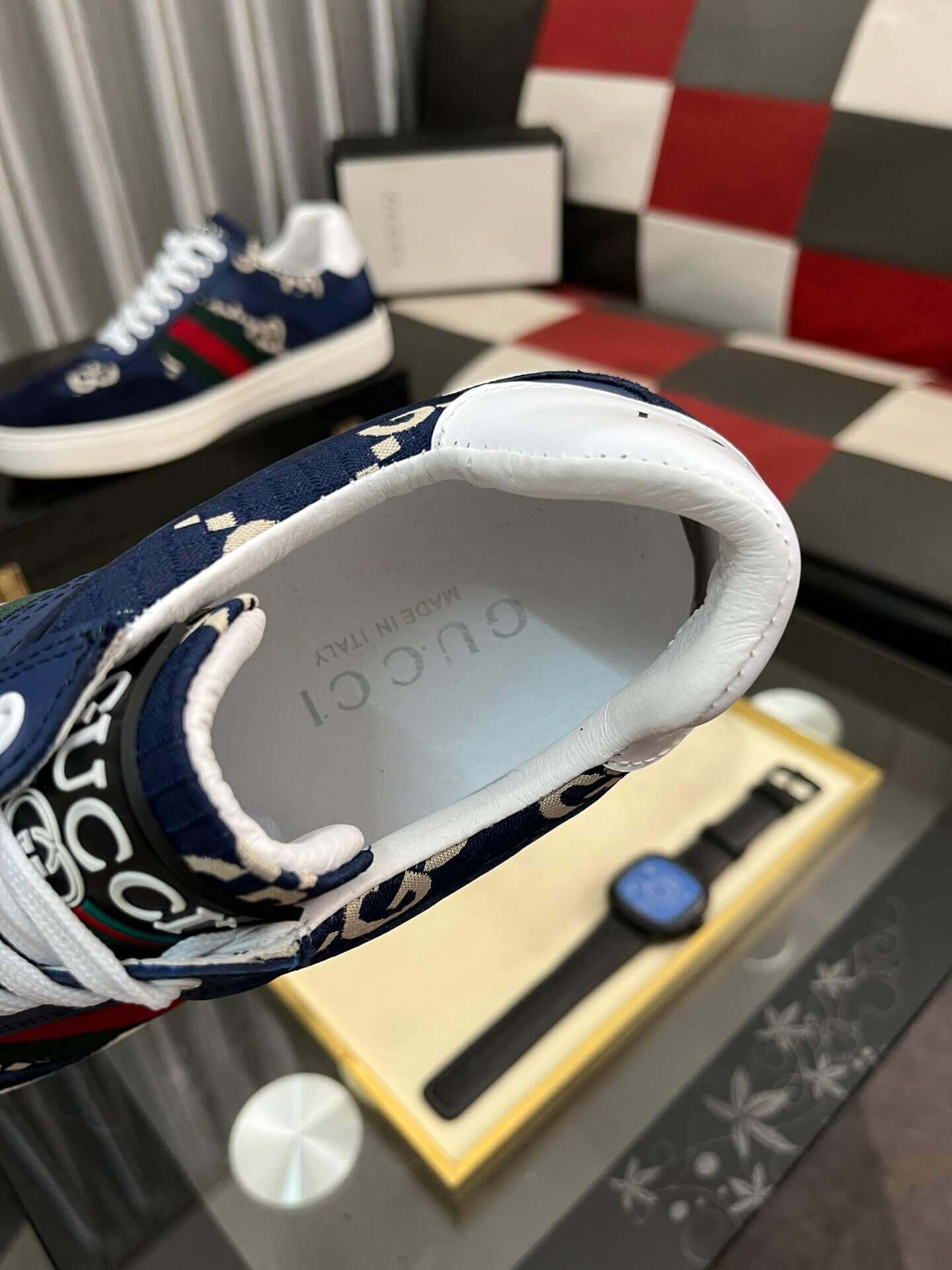 - Signature Web Stripe: Gucci’s unmistakable green and red Web stripe is prominently featured on the sides, instantly identifying these trainers with the brand’s renowned heritage.