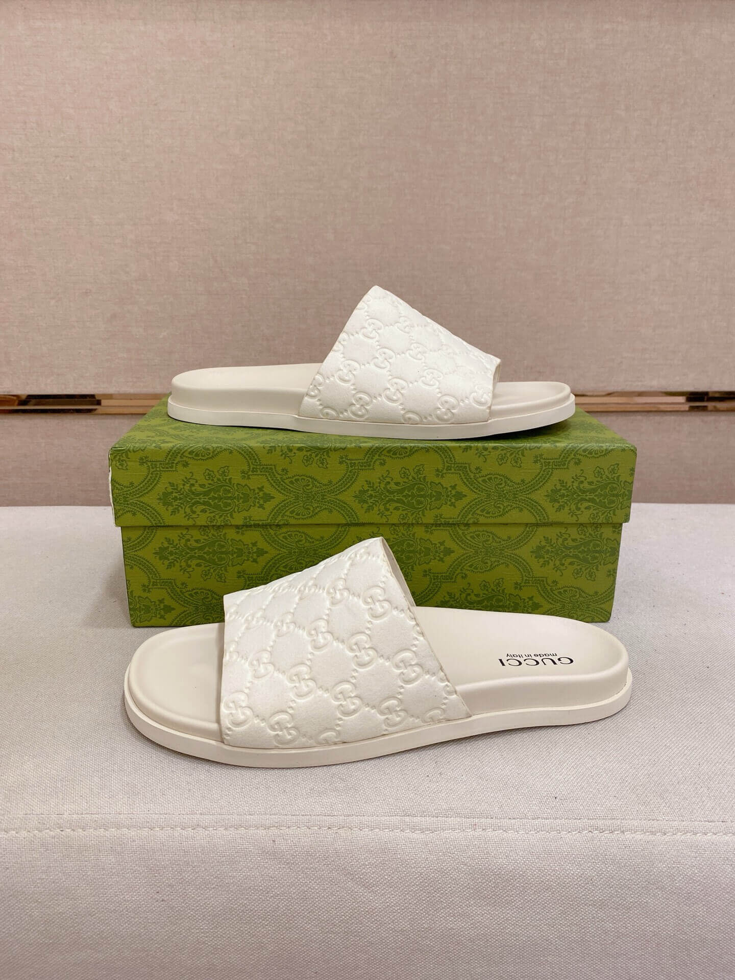 - Signature GG Embossing: Featuring an all-over GG embossed pattern on the crisp white rubber strap, these slides offer a subtle yet unmistakable nod to Gucci’s iconic design heritage.