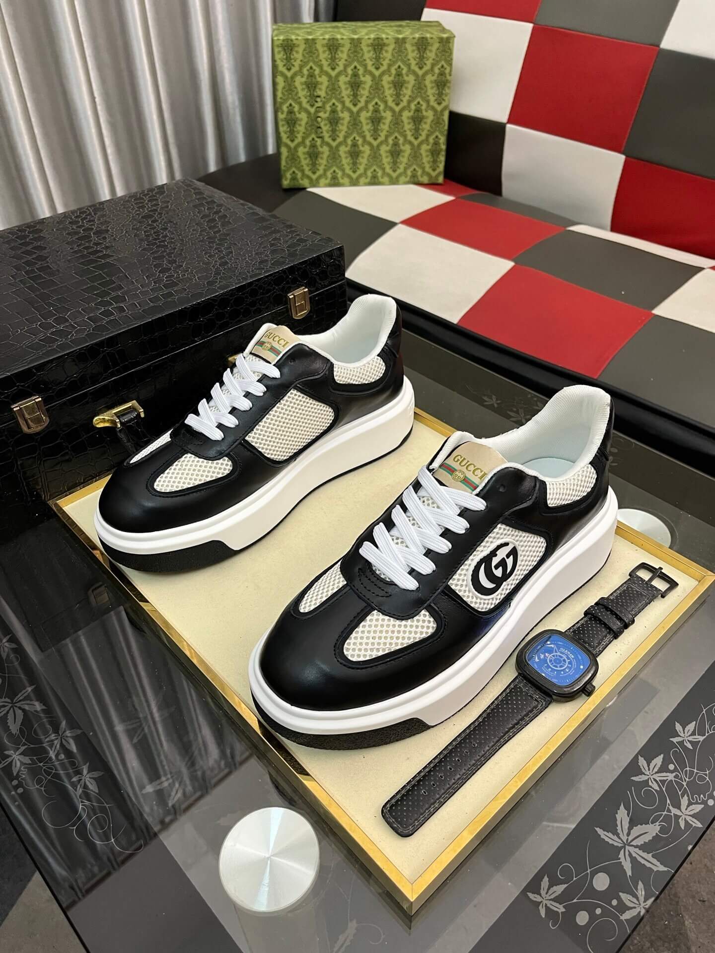 Elevate your casual footwear with the boldly retro and unequivocally luxurious Gucci Men’s Interlocking G Chunky B Sneaker. This striking low-top merges refined Italian craftsmanship with the coveted chunky shoe silhouette, featuring supple black leather overlays sharply contrasted by perforated white panels. A prominent Double G logo instantly marks this trainer as a statement piece from the House of Gucci, perfect for the modern collector.