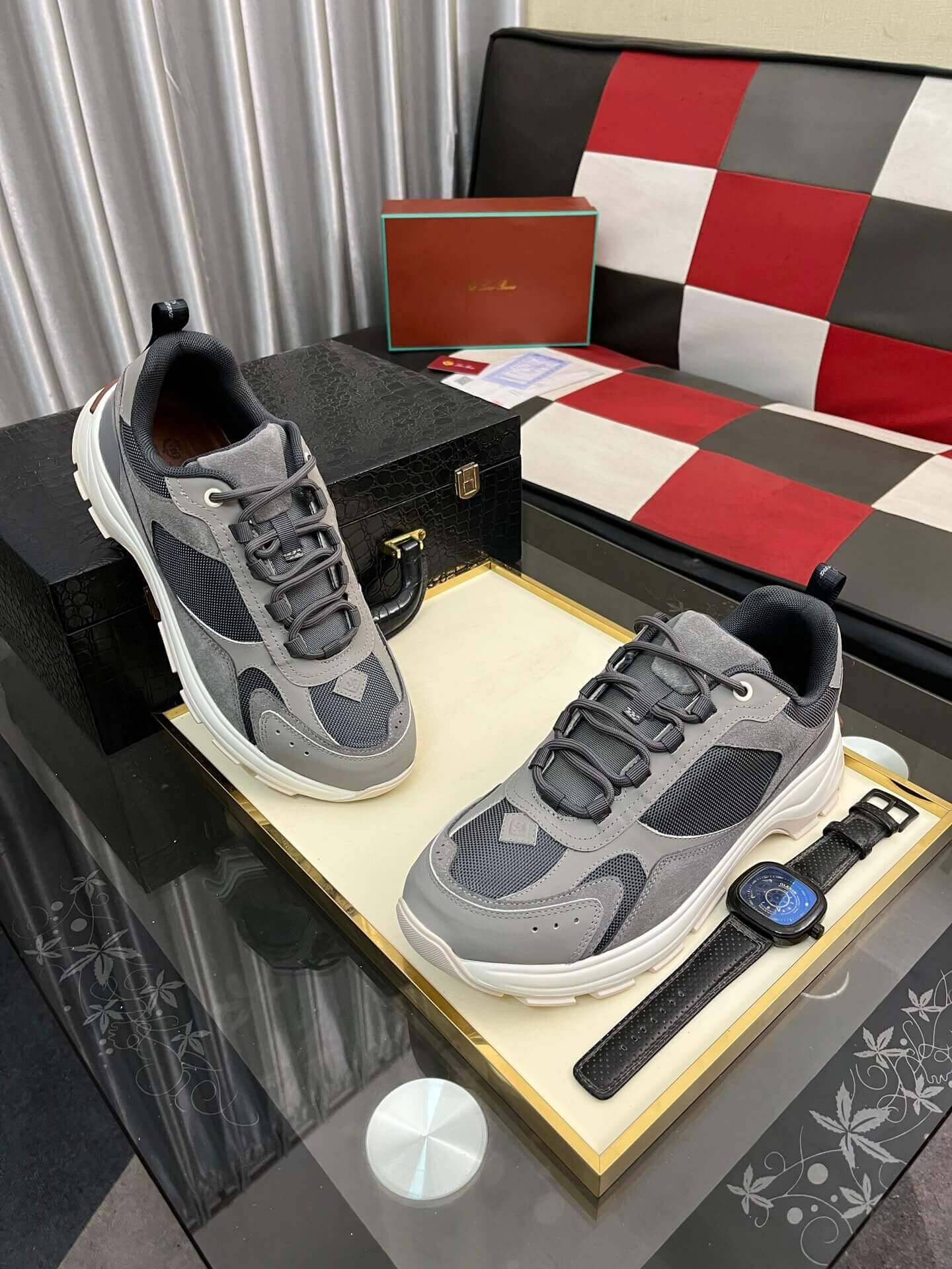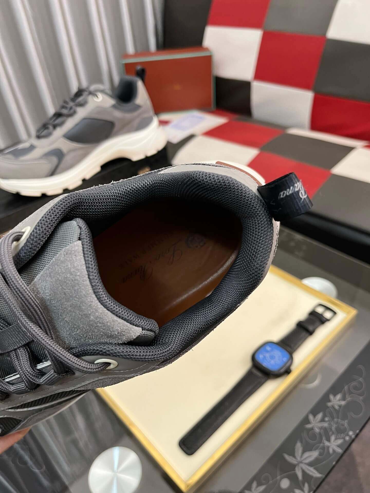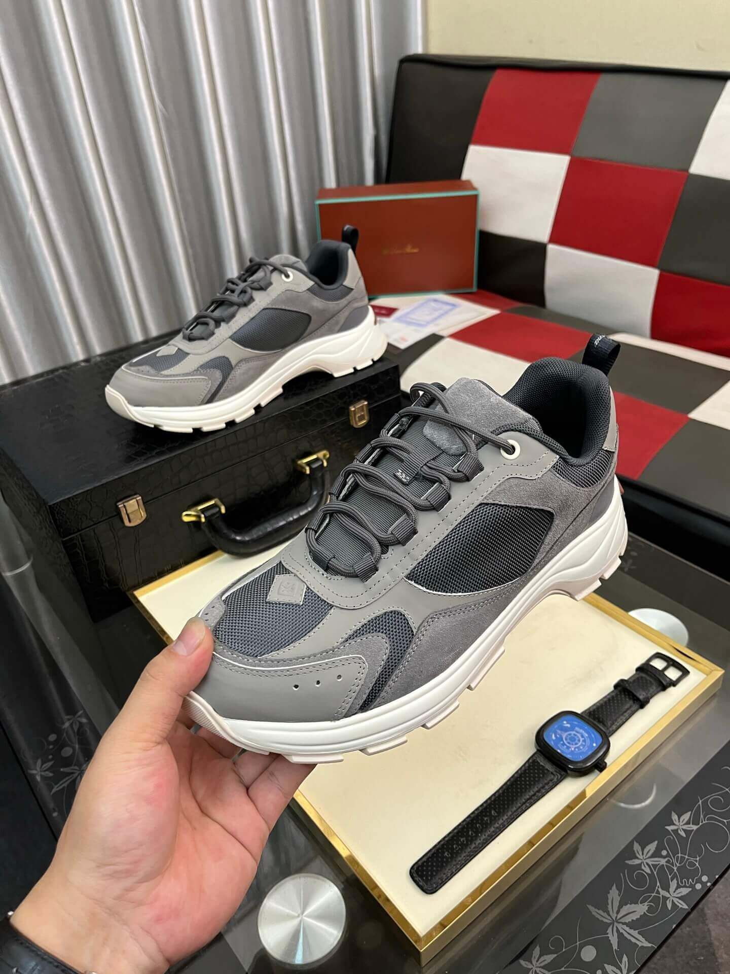 Discover the essence of understated luxury with these exquisite Loro Piana Cairn Walk sneakers. Presented in a versatile palette of grey tones, these trainers masterfully combine sumptuous suede with advanced technical mesh for a refined yet athletic aesthetic. Designed for the discerning individual, their ergonomic silhouette and robust, cushioned sole provide exceptional support and comfort for every step. A testament to Loro Piana’s unwavering commitment to premium materials and impeccable craftsmanship, these sneakers are the ultimate foundation for a stylish and comfortable experience, whether navigating urban landscapes or embracing the serenity of the outdoors.