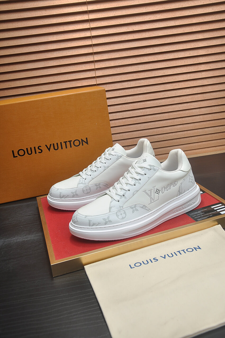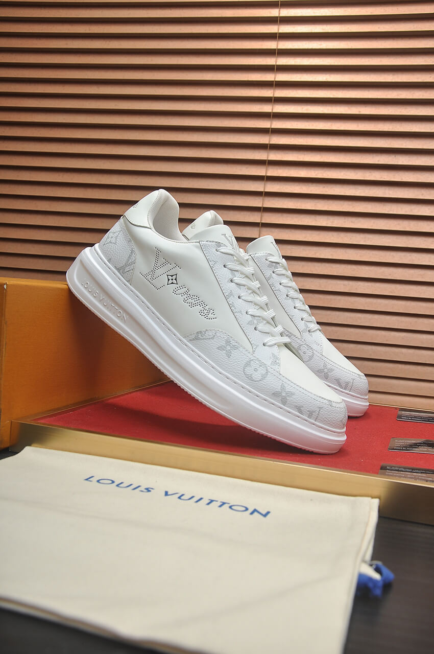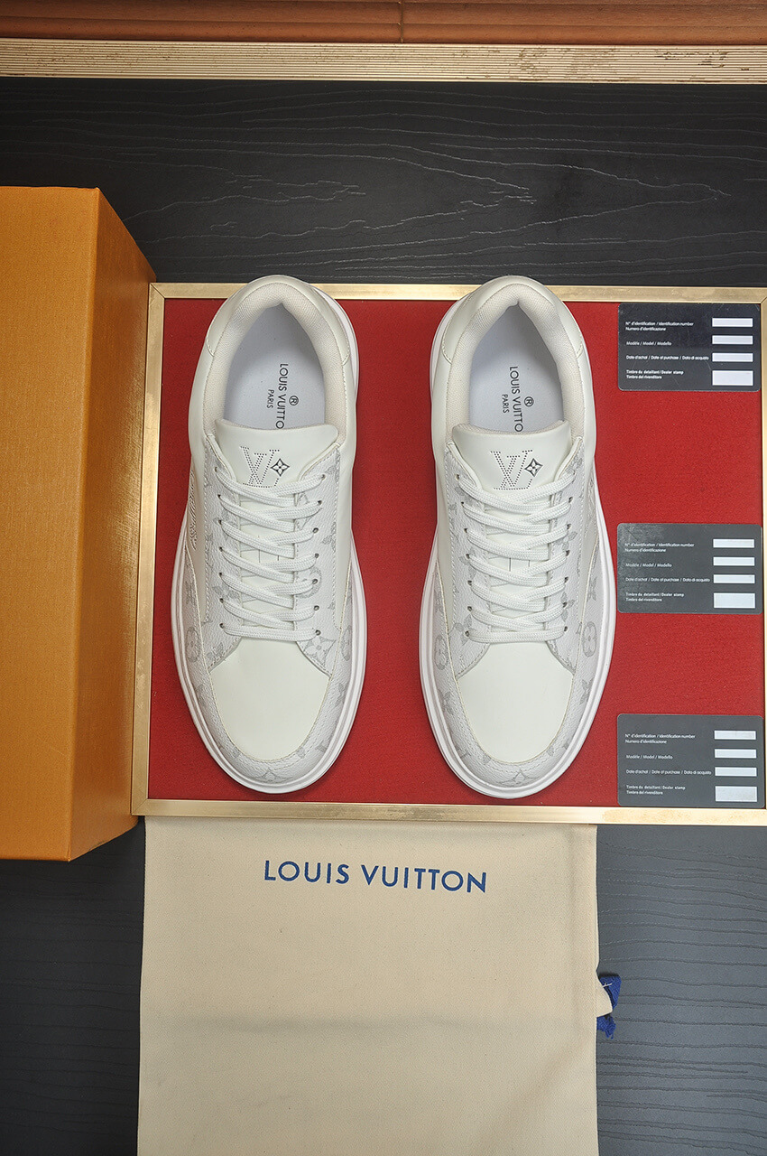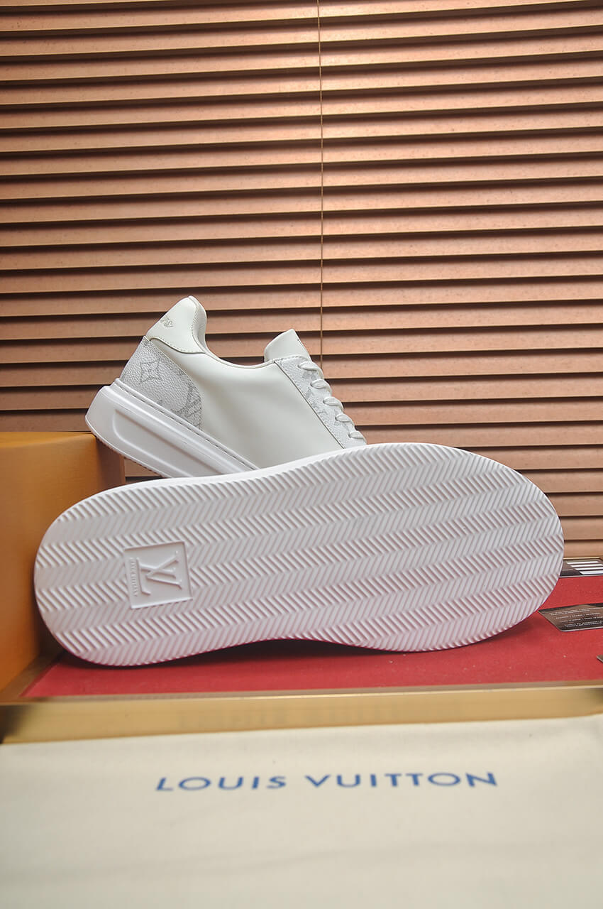 Making a striking debut from the menswear runway, the Louis Vuitton Beverly Hills Sneaker All-Over Monogram White is the embodiment of understated luxury. This pristine sneaker features a full-leather upper with a subtle, textured Monogram, making it a timeless classic with superior quality for refined casual wear.