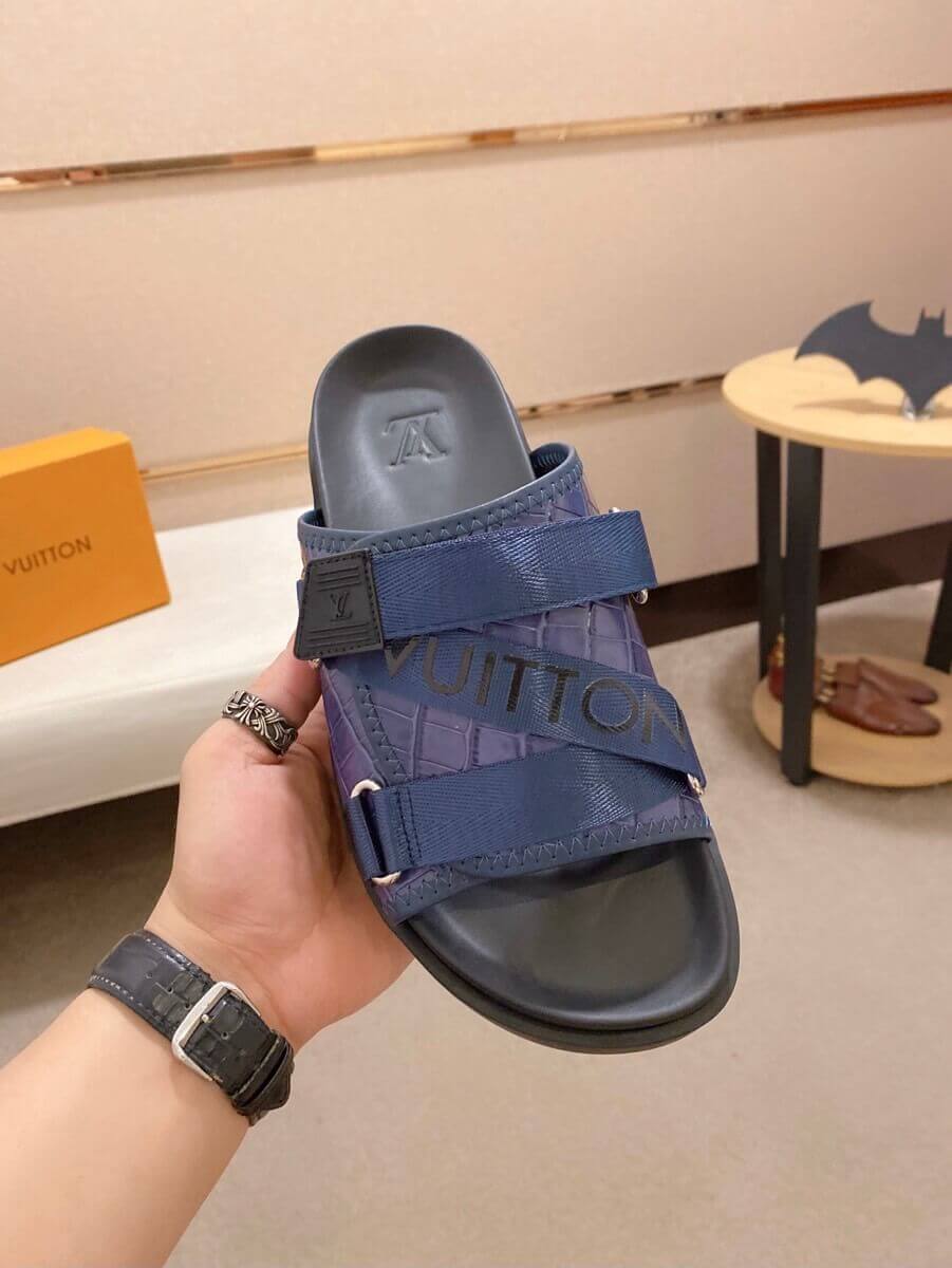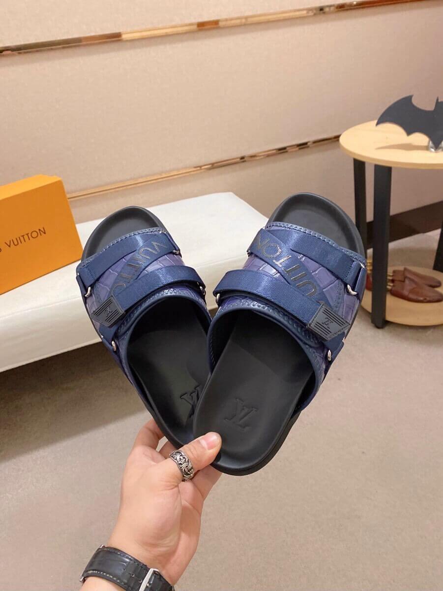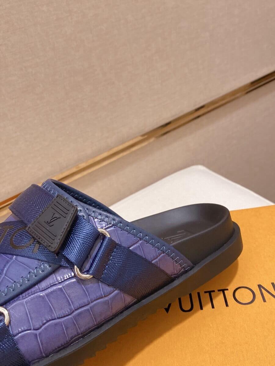 These Louis Vuitton Honolulu Mules blend effortless comfort with subtle luxury. The design features wide fabric straps in a deep blue, complemented by sections of embossed leather in a rich, dark blue that hints at deep purple undertones, subtly showcasing the iconic Louis Vuitton monogram. A prominent debossed “VUITTON” logo spans across the main strap, adding a clear brand statement. The mule’s easy-to-wear design, paired with a comfortable, contoured black footbed, makes these slides a sophisticated choice for relaxed elegance.