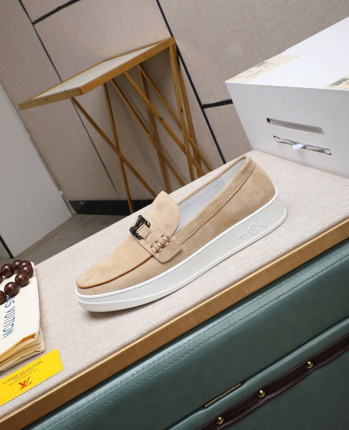 The Estate LV Buckle Suede Loafer reimagines traditional footwear with Louis Vuitton’s signature flair for blending heritage with the contemporary. The rich, soft texture of the tan suede provides a luxurious base, contrasting sharply with the bold, gleaming silver LV buckle that serves as the centerpiece of the shoe. While the shape is classic, the substantial, clean white rubber sole transforms the look, offering a sporty and casual edge that makes these loafers exceptionally versatile—perfect for pairing with linen trousers, tailored denim, or shorts. This shoe is a testament to Louis Vuitton’s commitment to craftsmanship, providing both a statement piece and a comfortable, high-quality driver-style option for year-round wear.