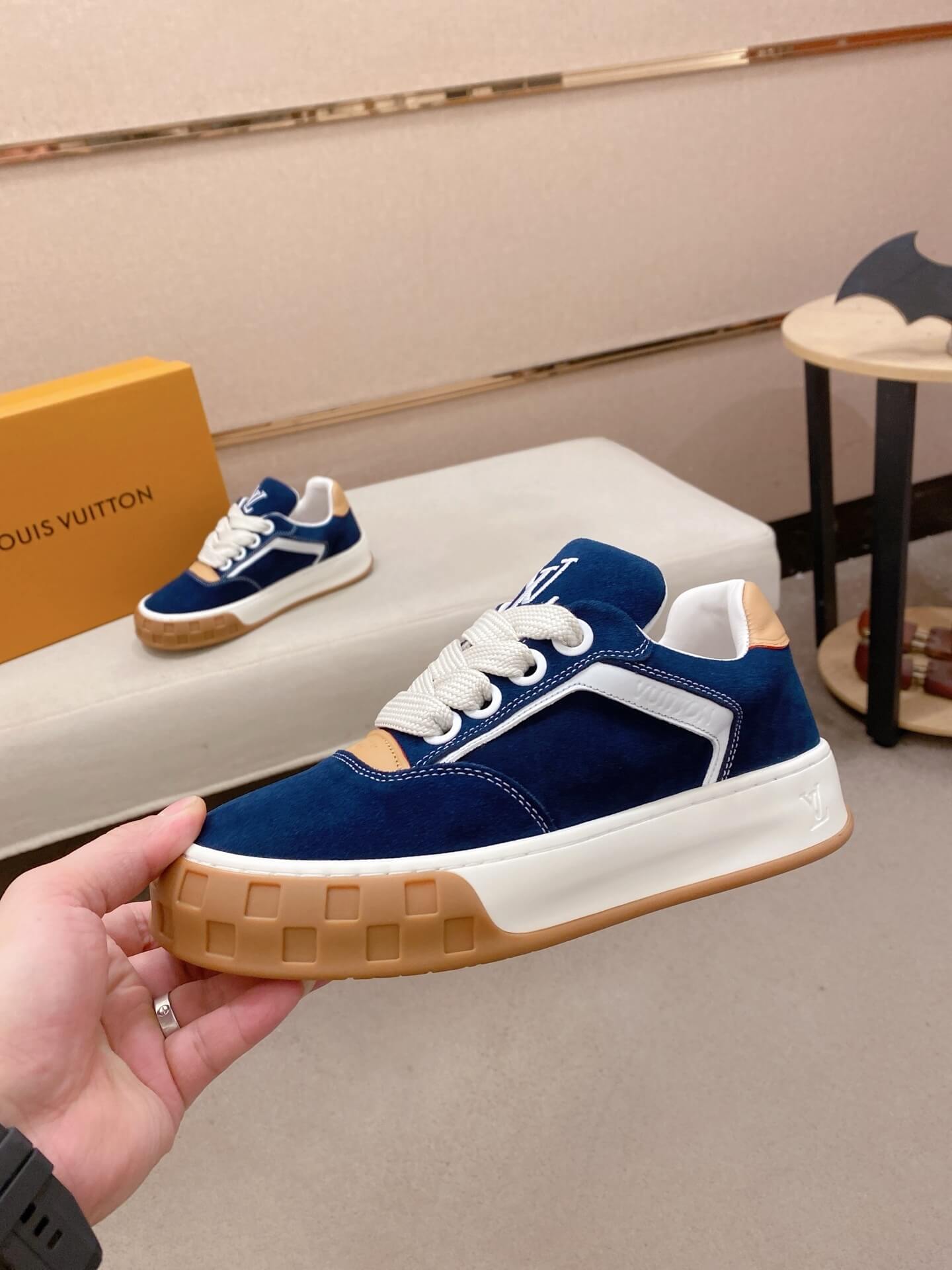 The selection of suede elevates this piece beyond standard trainers, positioning it as a key luxury item. The Dark Green LV Tilted Sneaker is ideal for the collector seeking both comfort and an impeccable designer pedigree. Add this premium Louis Vuitton piece to your archive today.