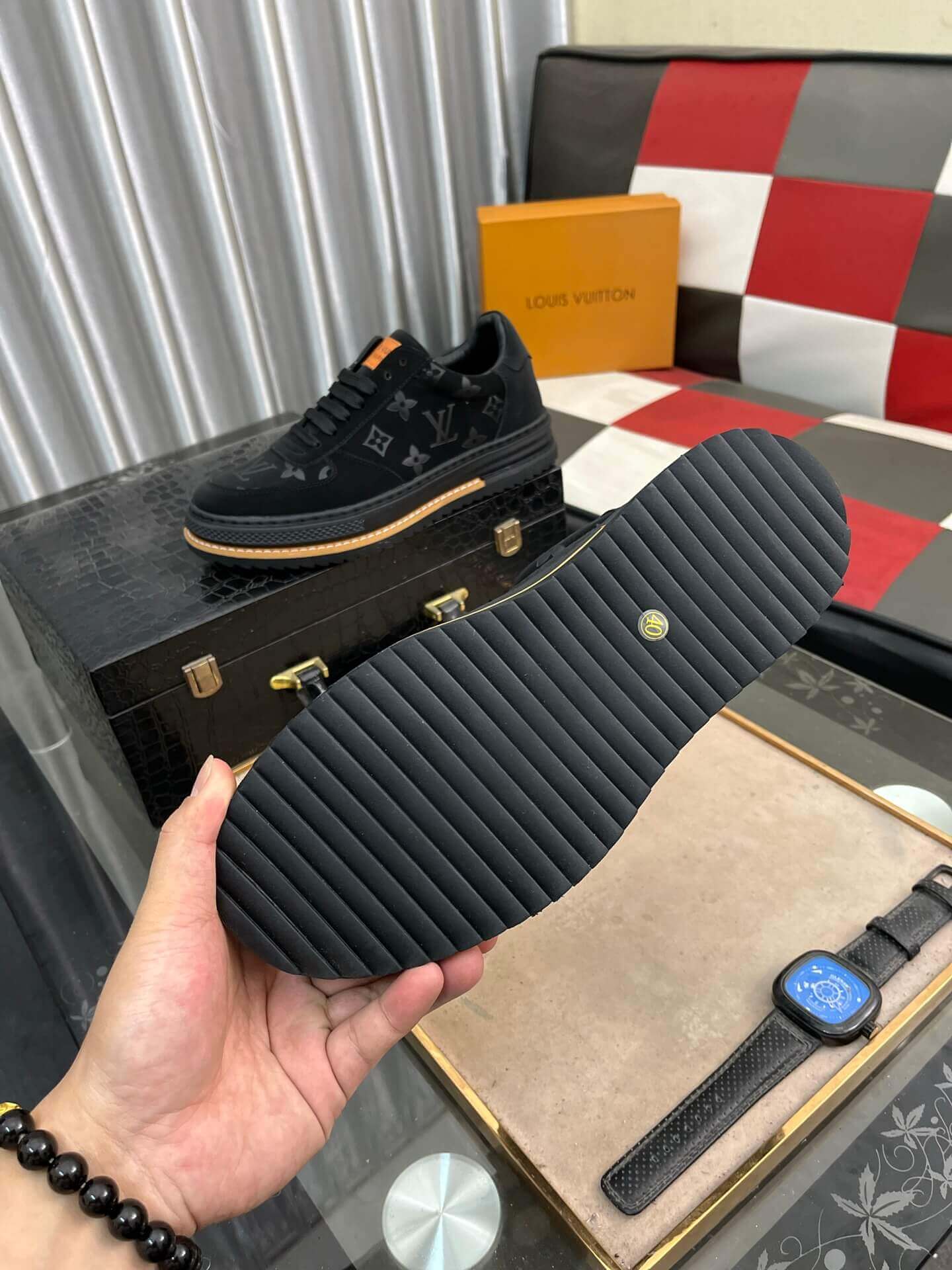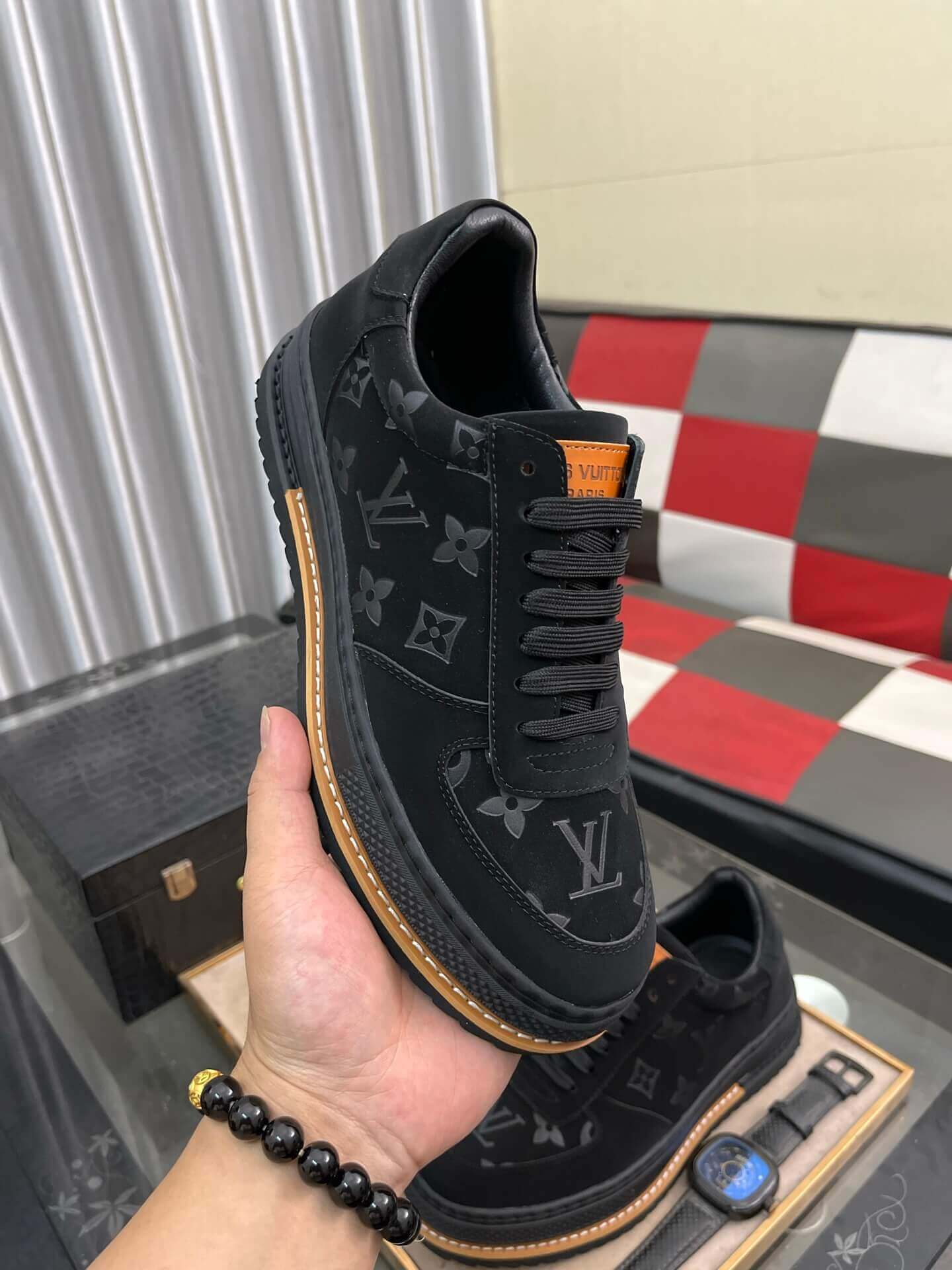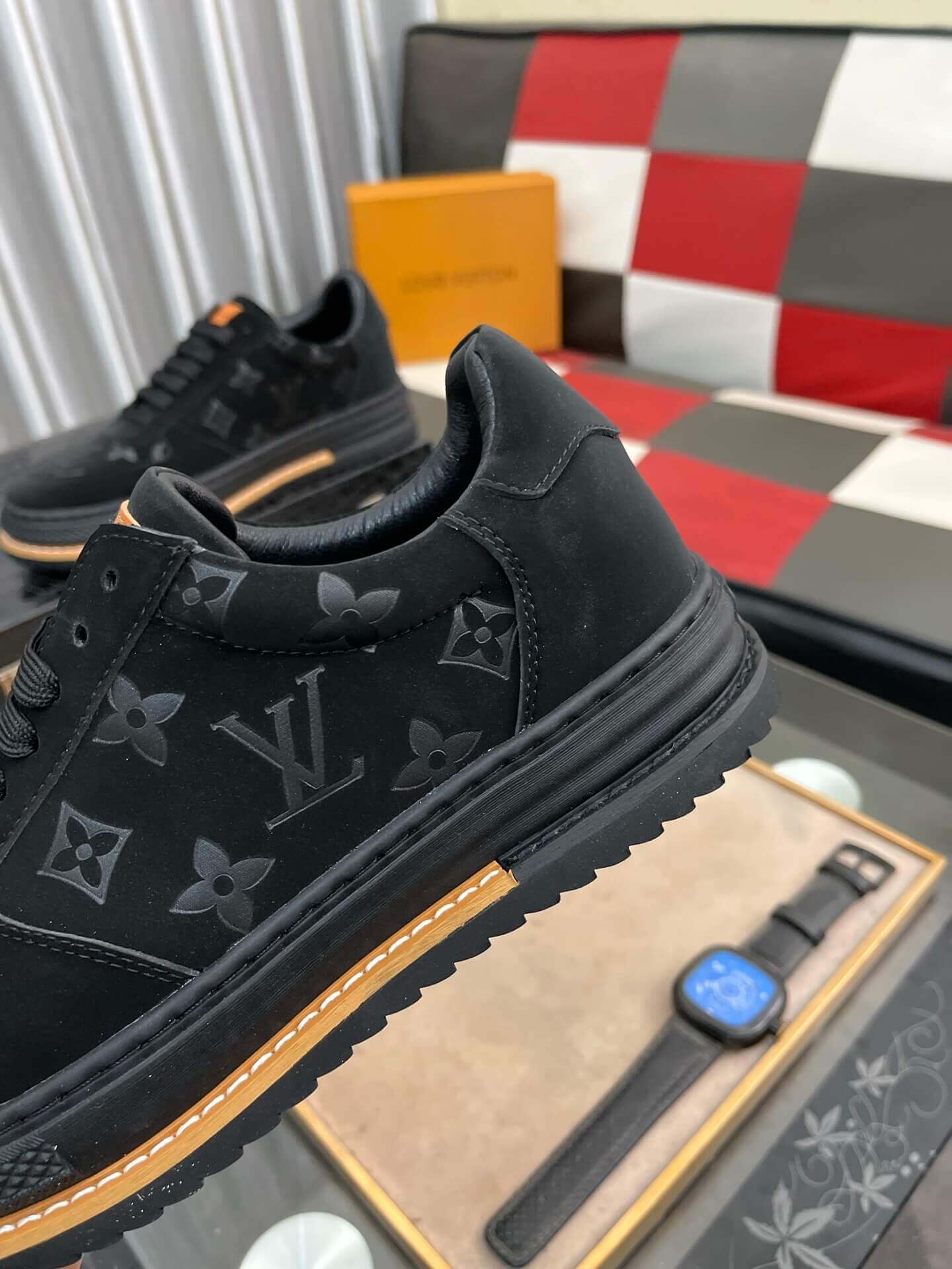 Bespoke your style with the Louis Vuitton LV Trainer Sneaker, a demonstration of refined luxury cast in all-black monogram leather. This low-top silhouette features subtly embossed Louis Vuitton motifs across the rich black calfskin, creating a textured yet understated statement. Accents of signature orange appear on the tongue, adding a discreet pop of color. Anchored by a tonal black rubber outsole with a fine orange line detail, this sneaker delivers both exceptional comfort and a sophisticatedly cool presence for the modern individual.