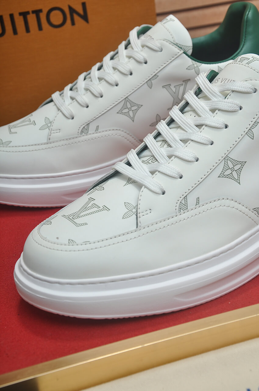 Introducing the dynamic Louis Vuitton Beverly Hills Sneaker Monogram Green and White, a sophisticated low-top blending comfort, classic Monogram elements, and a fresh burst of color. This high-quality sneaker is a timeless classic that made a striking debut on the Spring/Summer menswear runway.