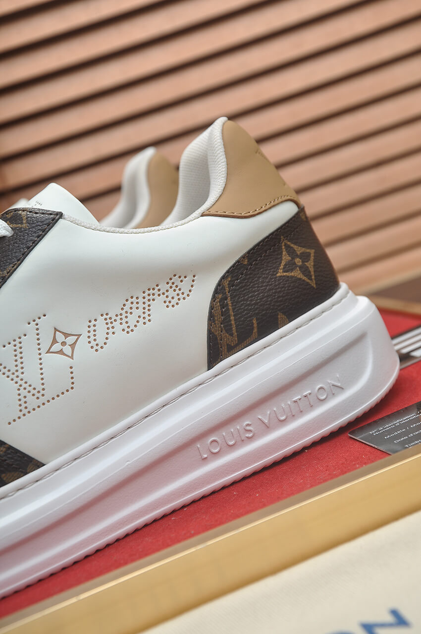 - Iconic Mixed-Material Upper: The design features striking color-blocking, combining the signature Louis Vuitton Monogram Canvas (brown/tan) on the toe and side panels with pristine White top-grain cowhide leather on the vamp and quarters.