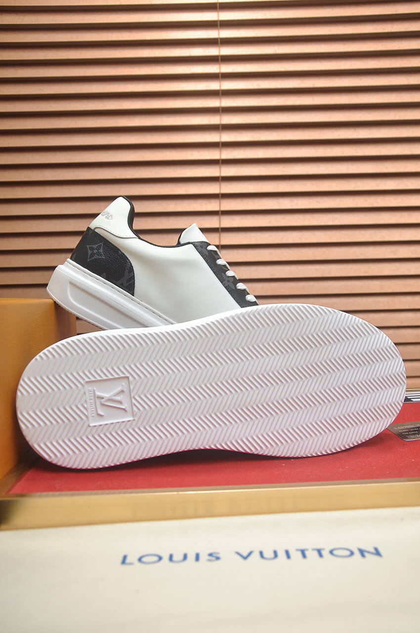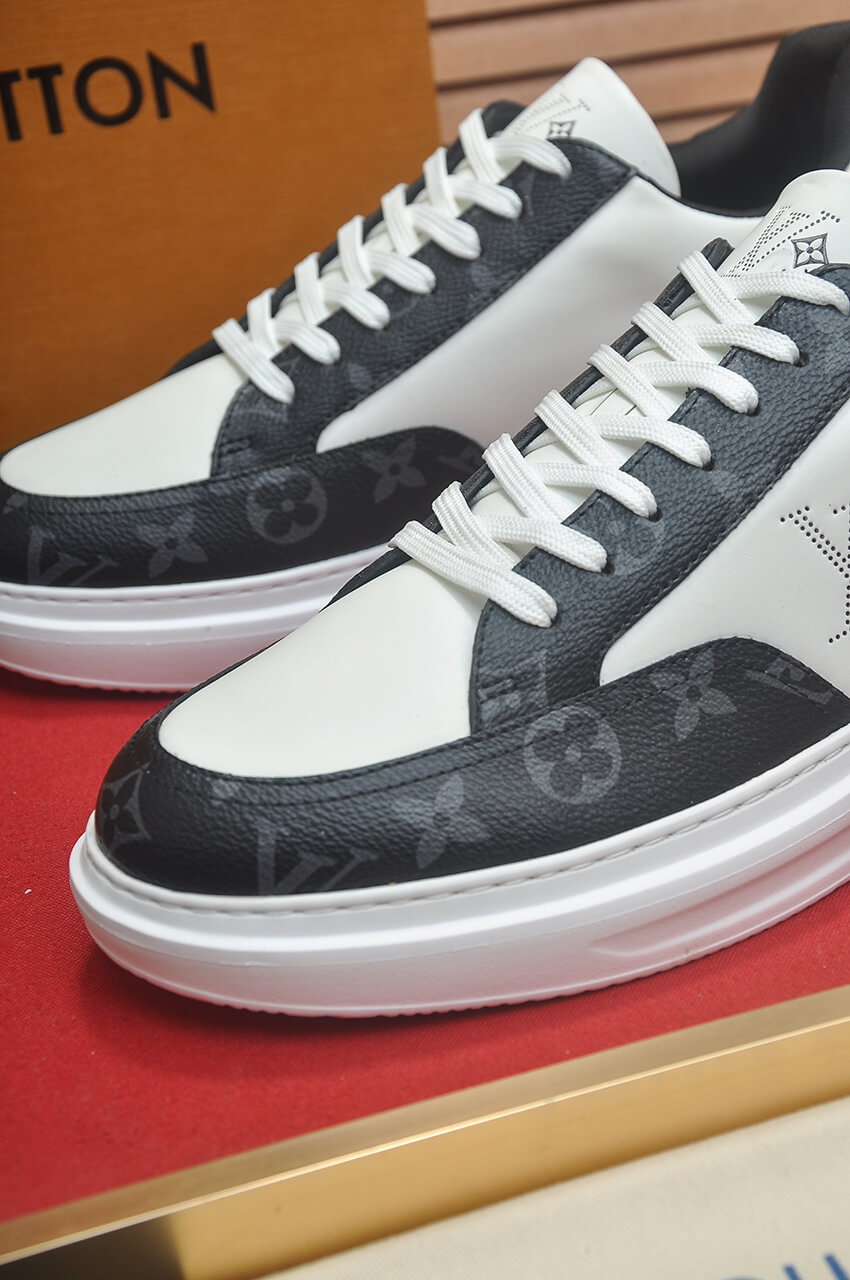- Striking Colorblock Upper: The shoe features a sharp contrast between pristine White top-grain cowhide leather and Black leather panels. The dark panels are detailed with a subtle Monogram print, offering a luxurious, mixed-material aesthetic.