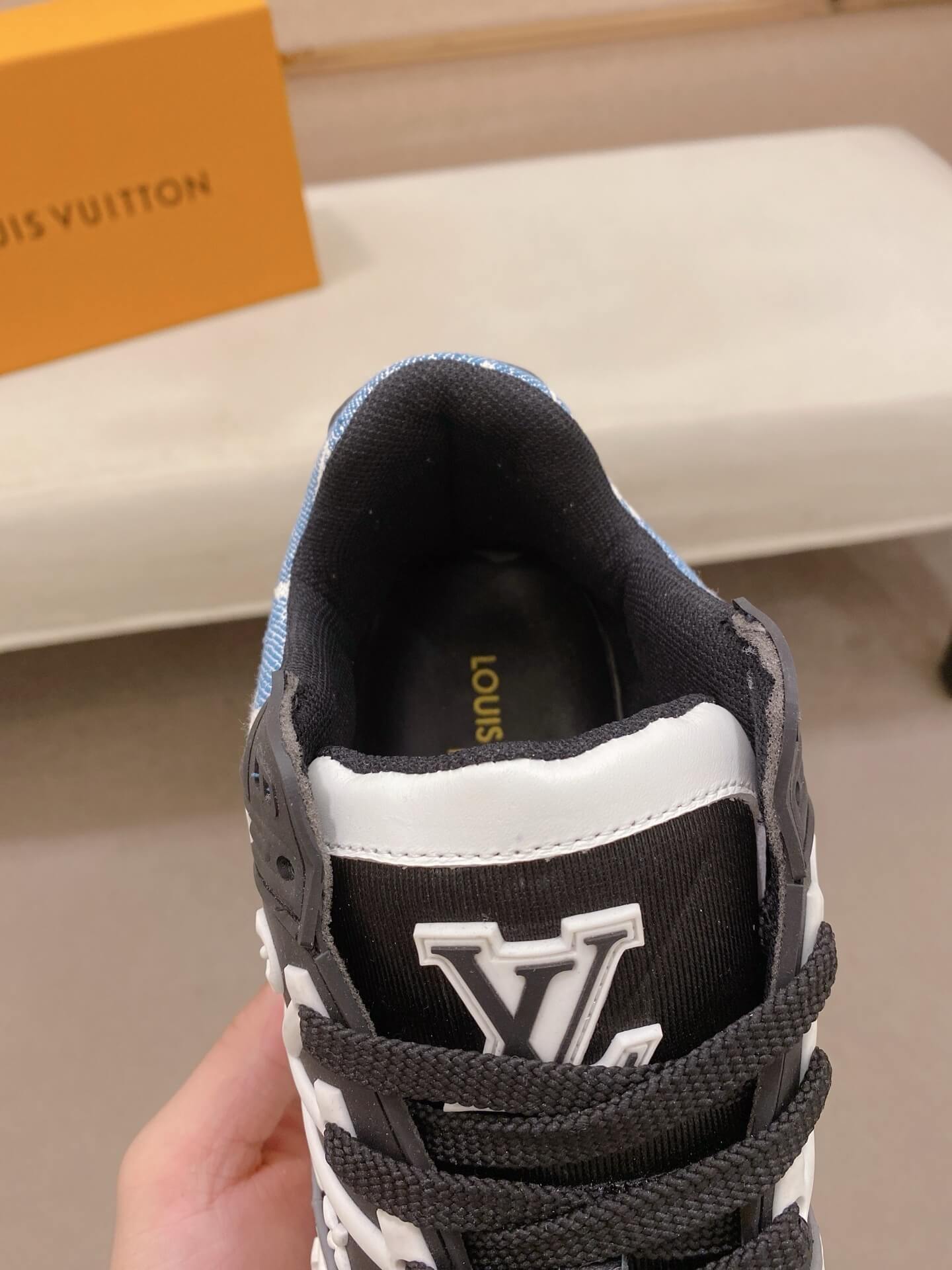 Rich Urban Aesthetic: The combination of denim, bold colors, and smooth leather establishes this Louis Vuitton Trainer as a cornerstone of elevated streetwear.