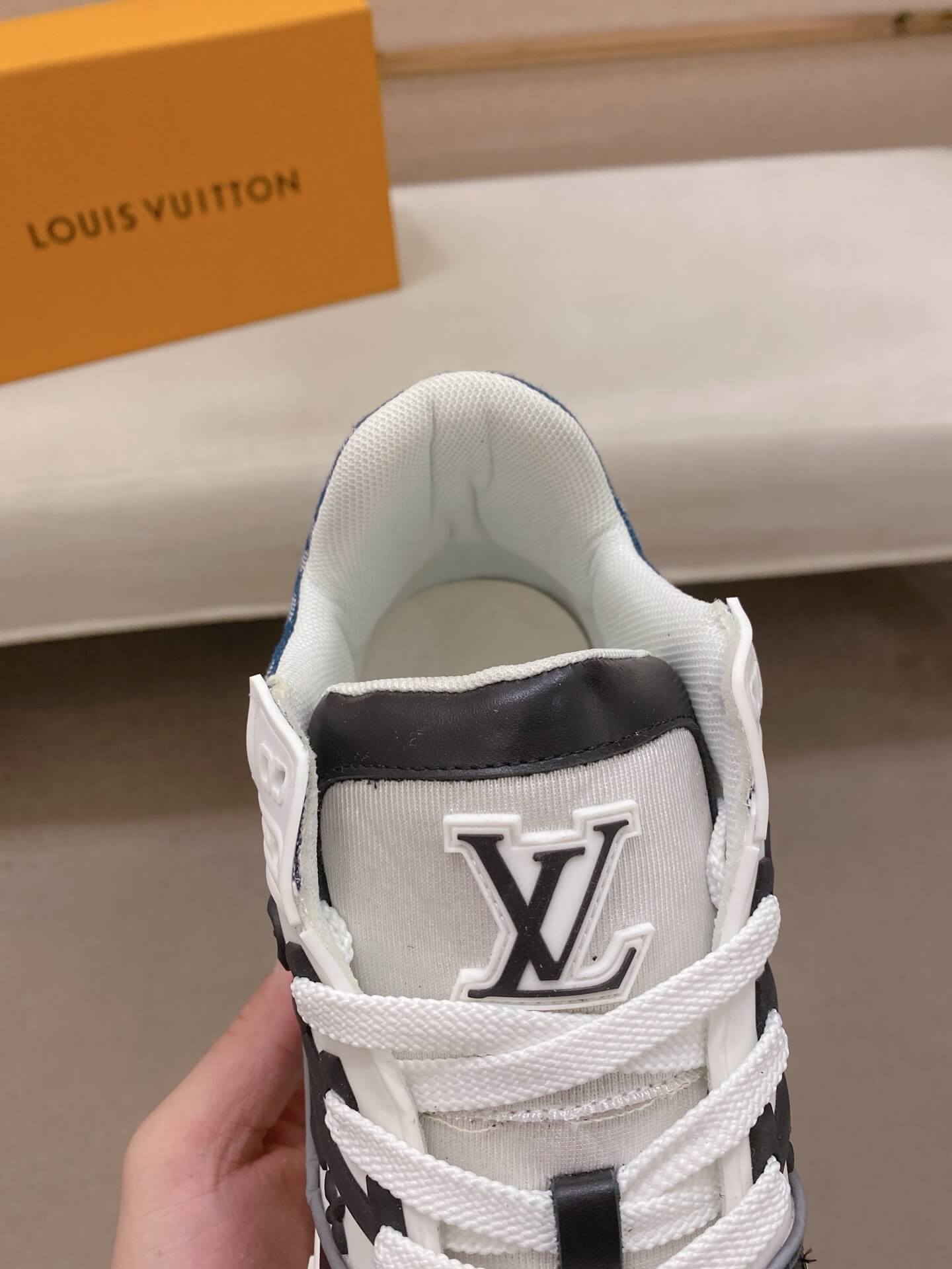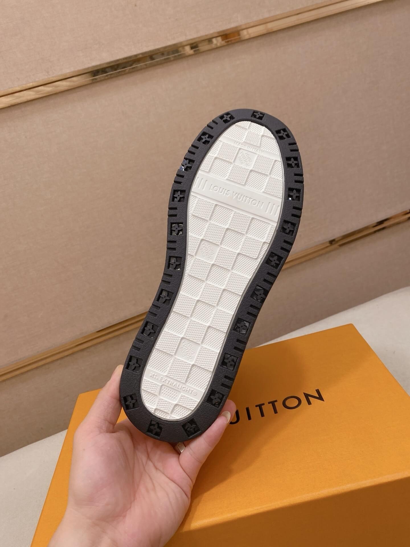 Iconic LV Signature: The side panels showcase the distinctive, oversized LV Initial outline, a signature of the LV Trainer collection.