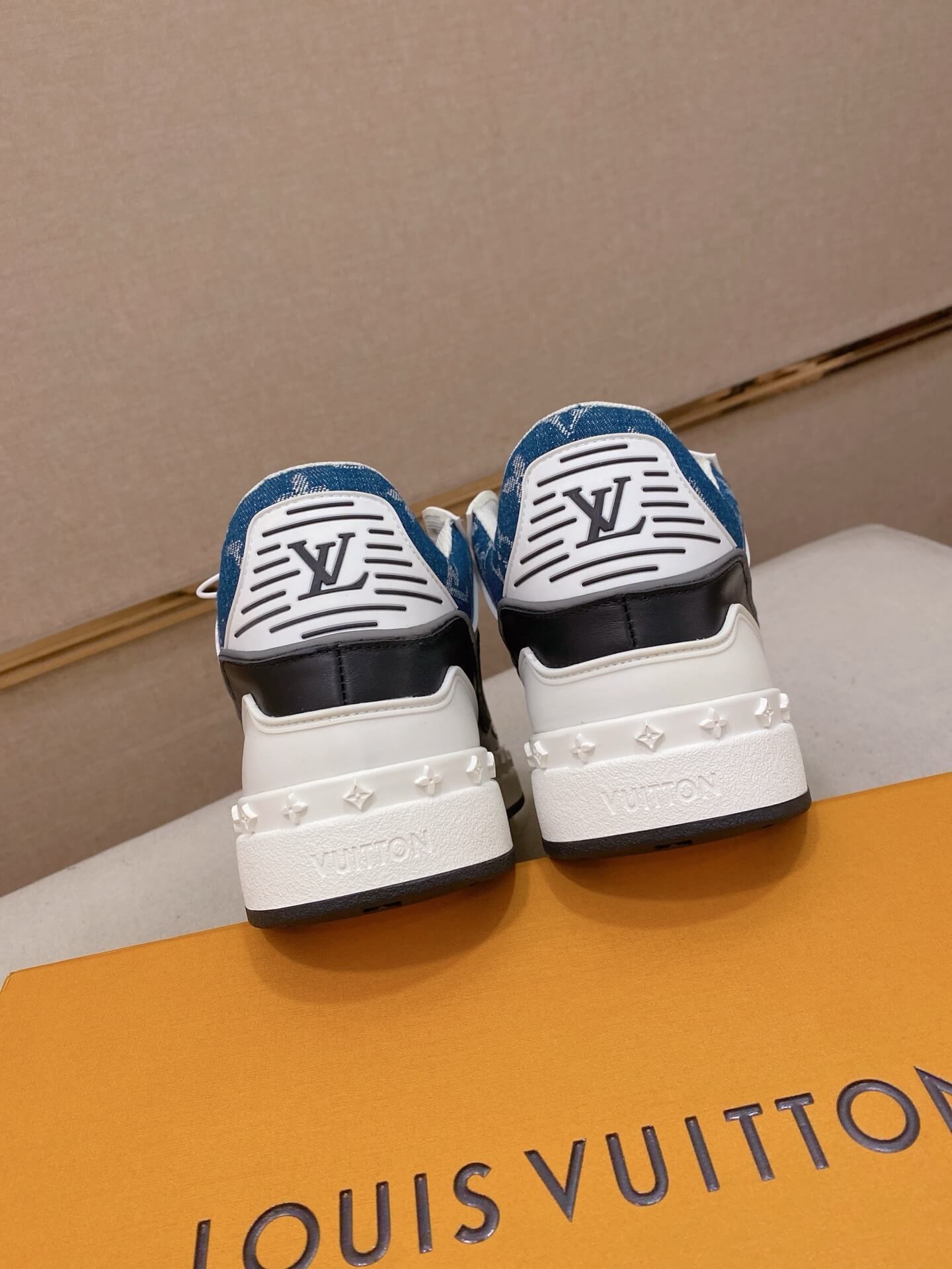 Rich Urban Aesthetic: The combination of denim, bold colors, and smooth leather establishes this Louis Vuitton Trainer as a cornerstone of elevated streetwear.