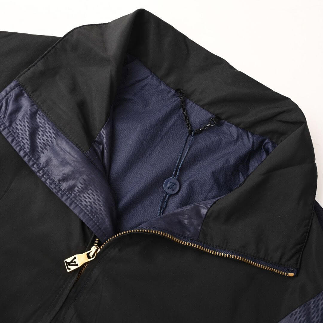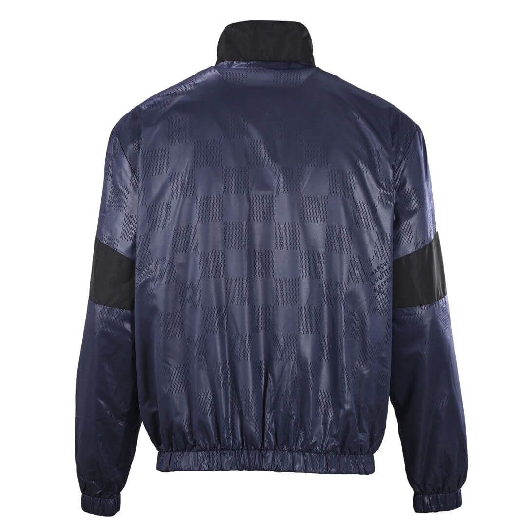 The Louis Vuitton Technical Nylon Windbreaker is an essential garment for those who appreciate functional luxury. The front showcases a contemporary color block design, with a bold black panel across the shoulders and a stand-up collar, complemented by the rich navy body. The entire navy section is subtly adorned with an embossed Damier pattern, a nod to the House’s iconic design language. On the left chest and right arm, “LOUIS VUITTON SPORTSWEAR” is integrated into the pattern, adding an exclusive touch. The back continues this sophisticated design, with the embossed Damier pattern dominating the navy, and the “LOUIS VUITTON SPORTSWEAR” text appearing on the right side. This windbreaker is the perfect fusion of athletic inspiration and refined Parisian style.