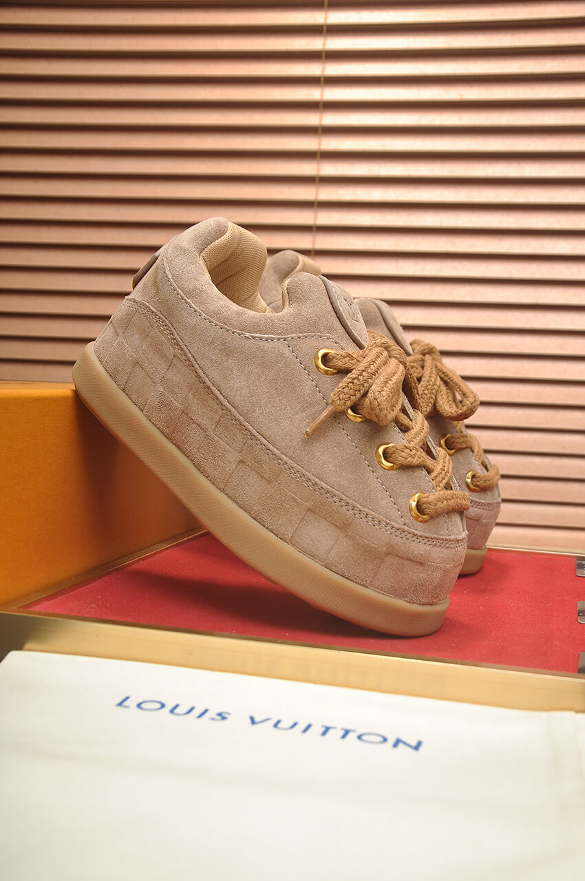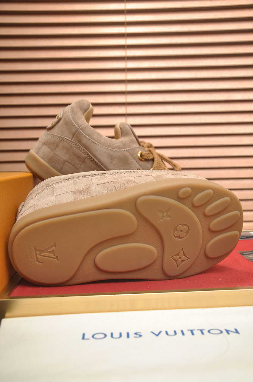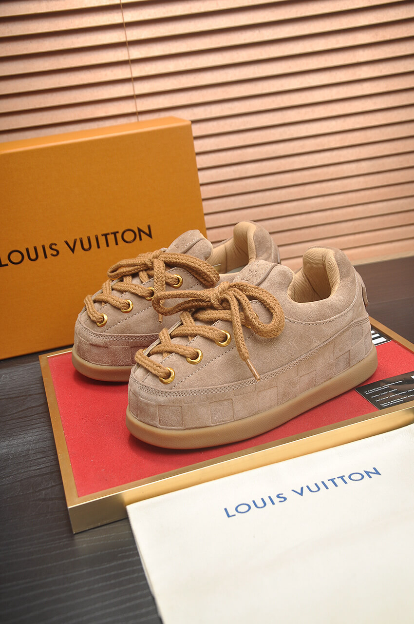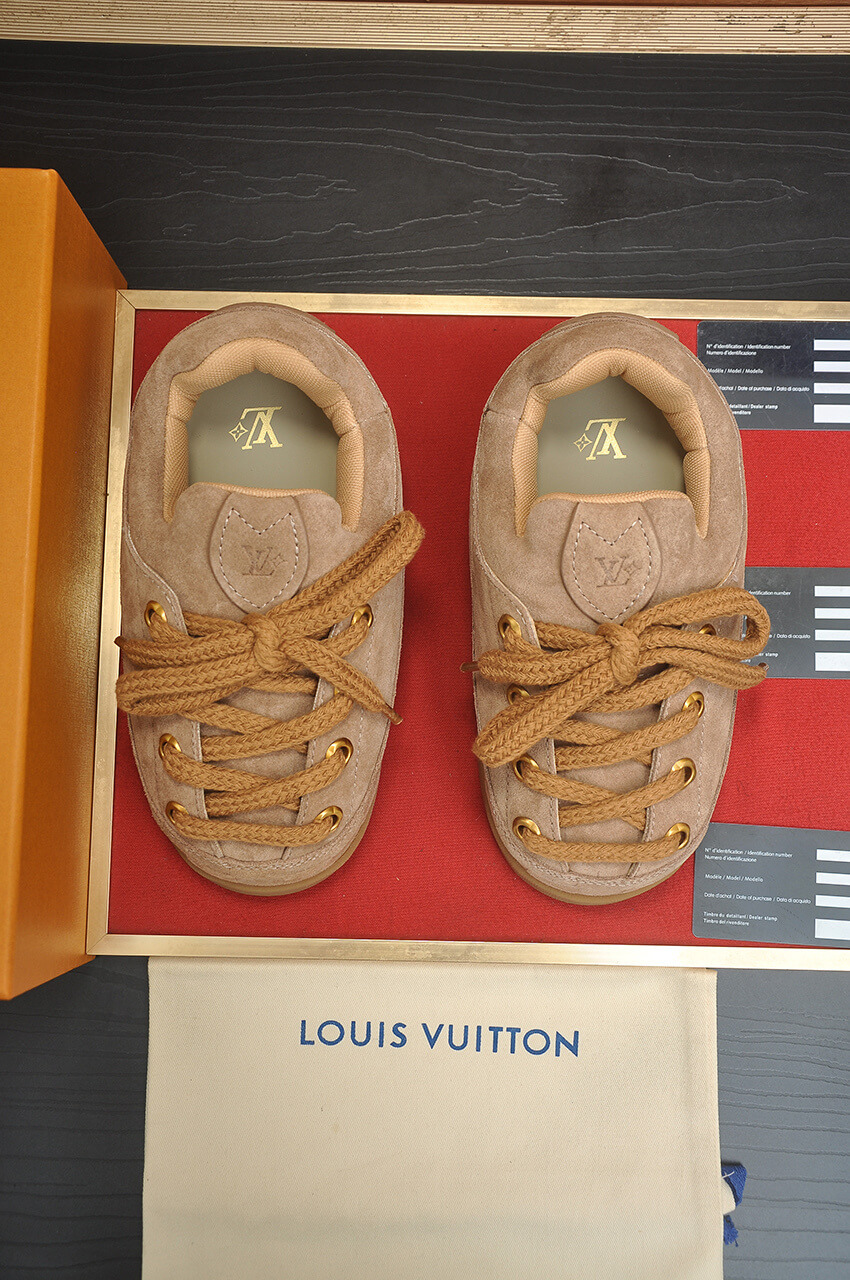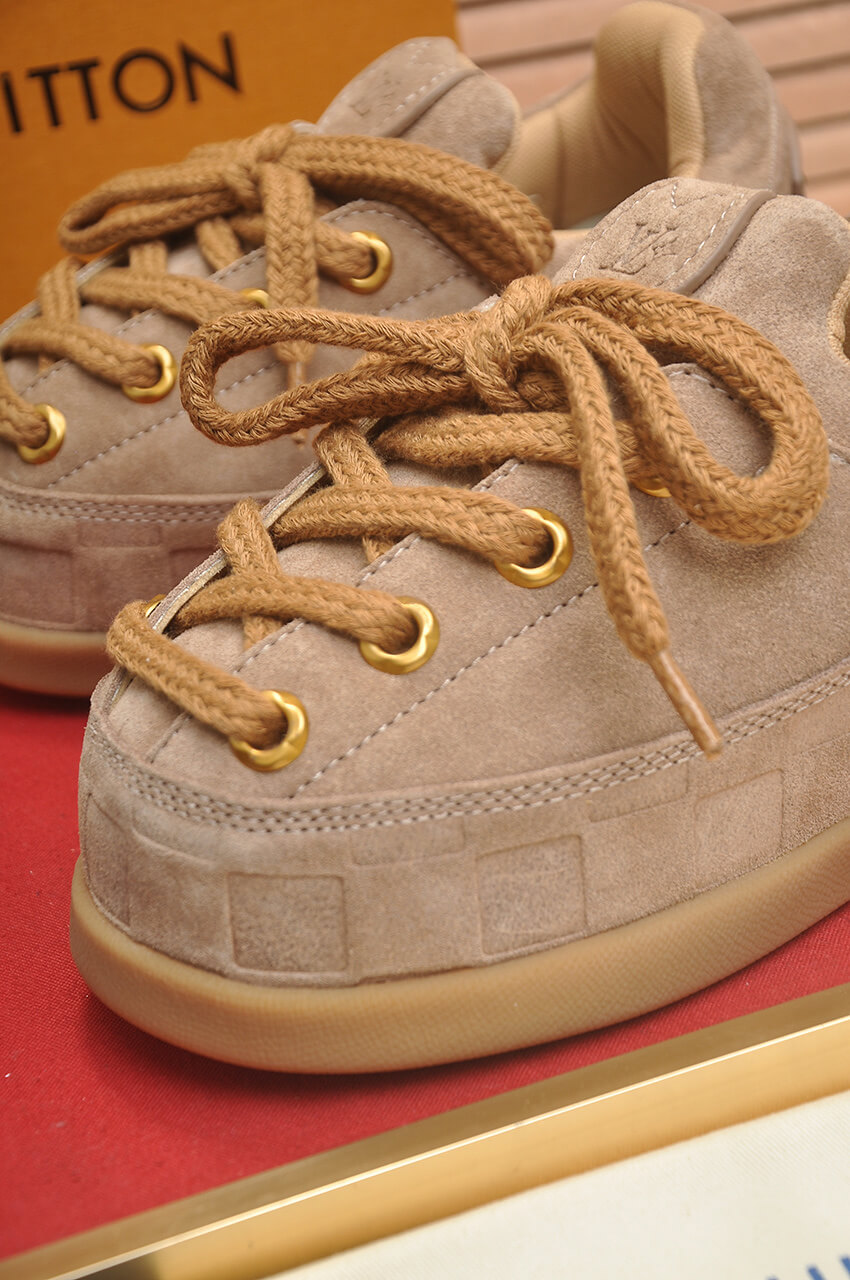 Step into the signature style of the LV x NIGO collaboration with the Louis Vuitton x NIGO LV Yeti Lace-Up Suede in Tan. This unique sneaker is a classic and versatile piece, retaining the recognizable chunky silhouette and featuring rugged lace detailing, making it a favorite among internet celebrities and stars.