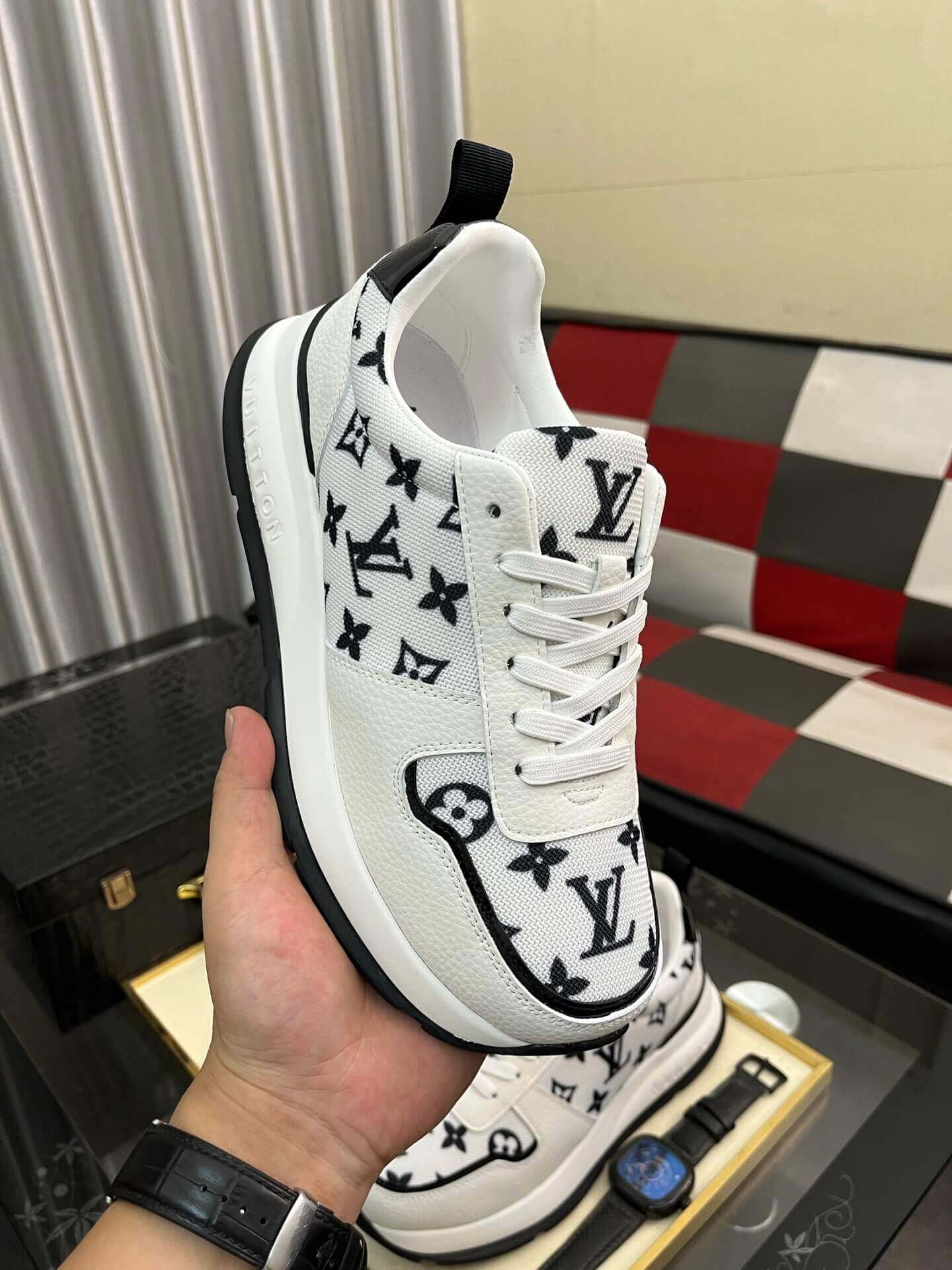 - Dynamic Bi-Color Design: Featuring a captivating black and white composition, these trainers boast white panels adorned with subtle debossed Louis Vuitton monogram patterns, complemented by sleek black leather accents.