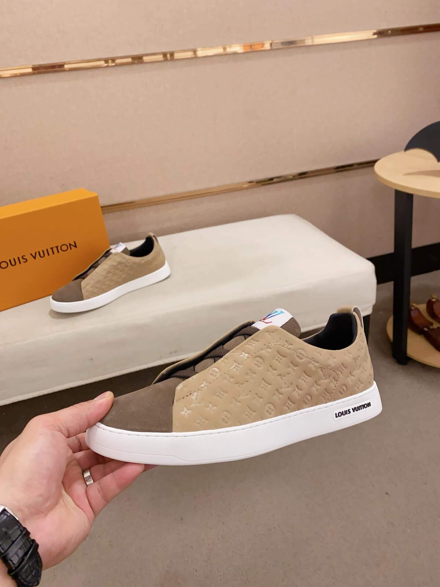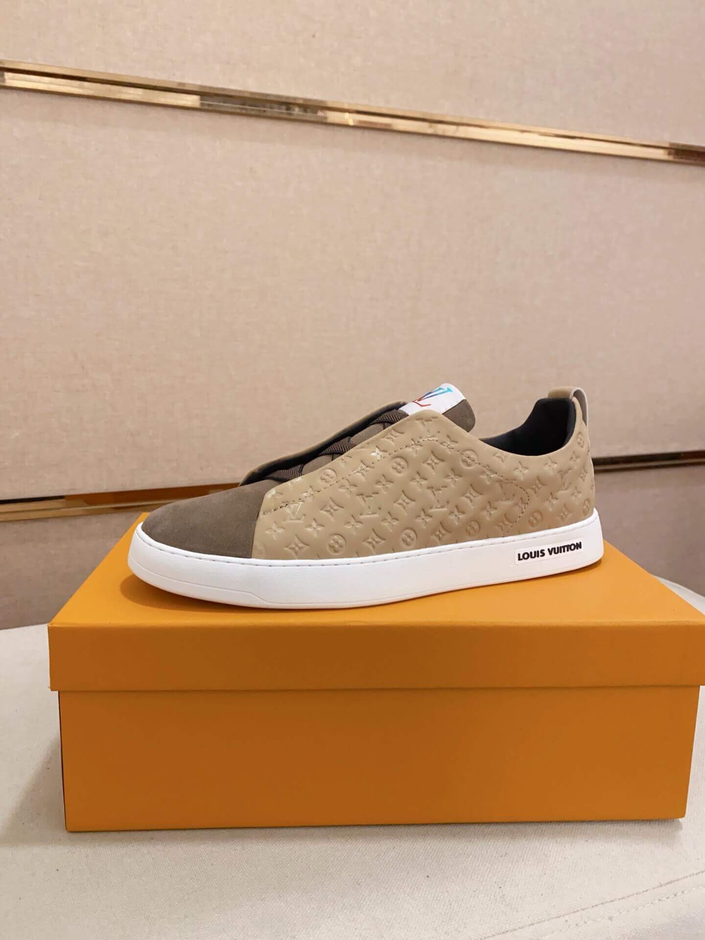 Discover understated luxury with the LV Slip-On Sneakers, featuring a sophisticated blend of beige Monogram embossed leather and smooth suede. These effortlessly chic sneakers boast a streamlined slip-on design, with the iconic Louis Vuitton Monogram subtly debossed on the beige leather mid-section, complementing the plush beige suede toe. A clean white rubber sole provides a fresh contrast and comfortable wear, while a discreet Louis Vuitton branding on the sole and a small colored tab on the heel add refined details. These sneakers are ideal for elevating your casual attire with a touch of timeless elegance.