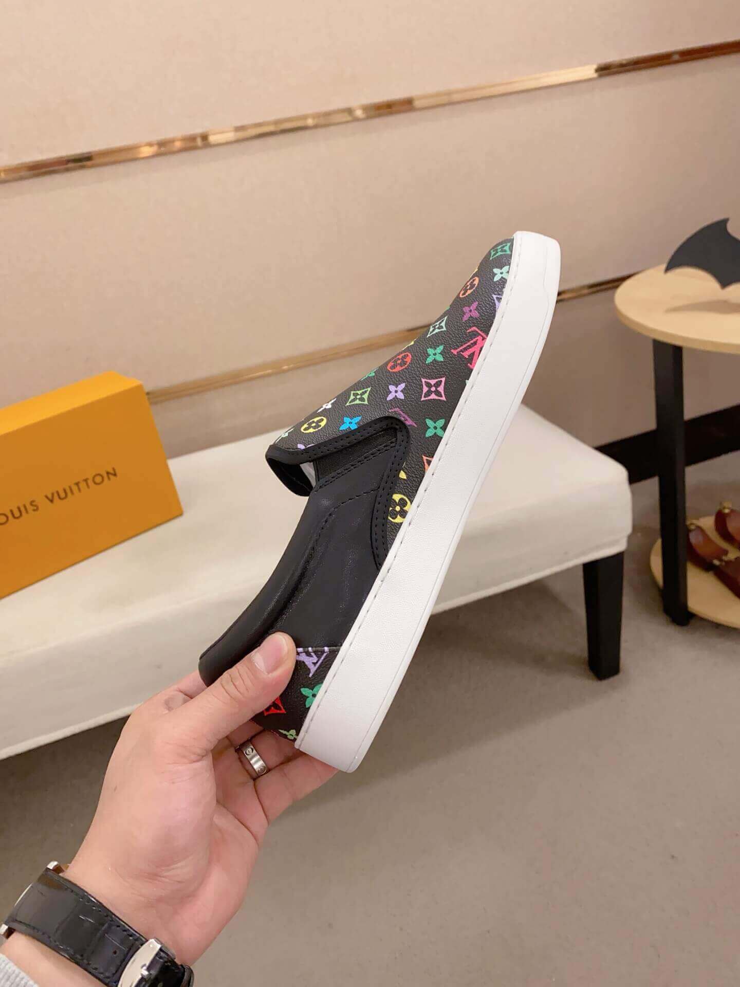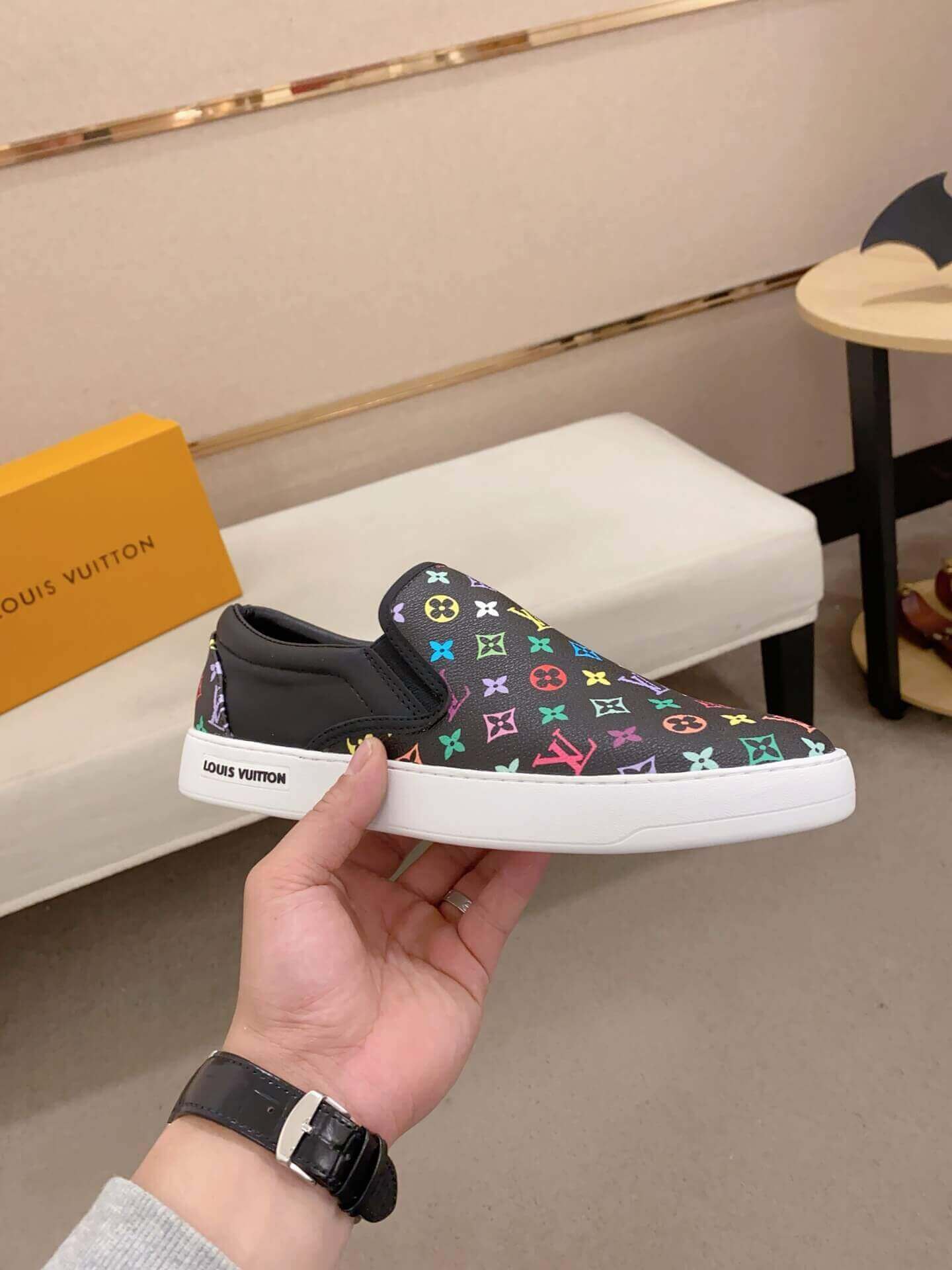 These playful Louis Vuitton slip-on sneakers inject a burst of color into an iconic design. The black canvas upper is vibrantly adorned with a mosaic of multicolored Louis Vuitton monogram symbols, a creation of the legendary Takashi Murakami, creating a dynamic and eye-catching pattern. Sleek black leather detailing enhances the silhouette, while a clean white rubber sole provides a fresh contrast and features “LOUIS VUITTON” branding on the side. Perfect for those who appreciate bold personal expression and luxurious, easy-to-wear footwear.